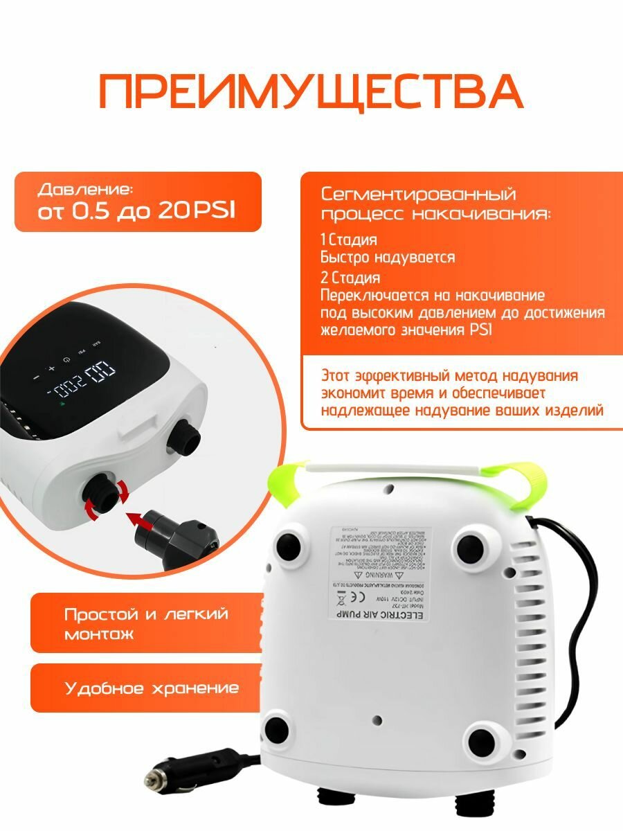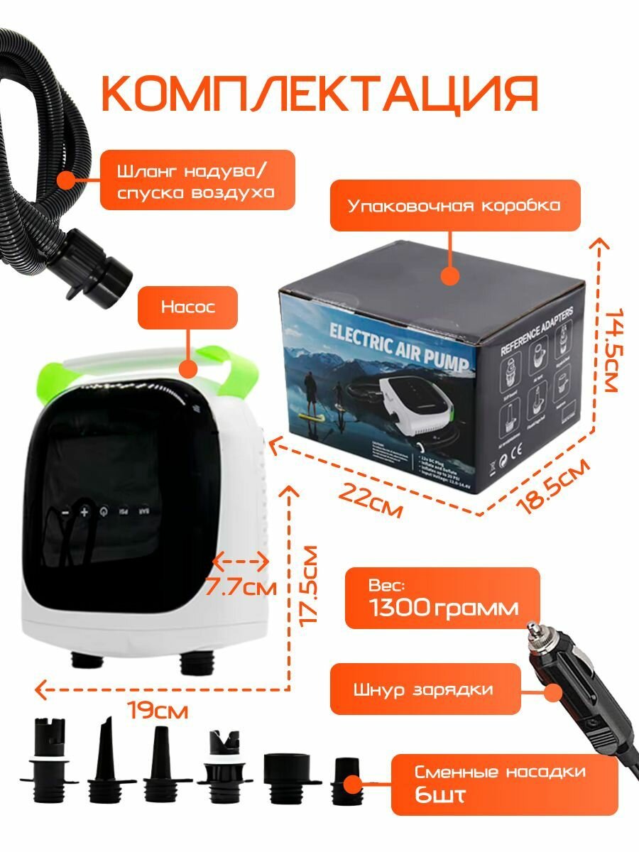 Представляем электрический воздушный насос с 6 сменными насадками. Подходит для накачивания широкого спектра продуктов, связанных с водой: таких как доски для серфинга, sup-доска, надувные лодки, надувные матрасы и надувные бассейны. Оснащенный ЖК-дисплеем высокой четкости, этот лопастной насос обеспечивает точные показания давления в реальном времени, позволяя с точностью и легкостью контролировать процесс накачивания. Портативный насос оснащен интеллектуальной и безопасной системой давления, которая позволяет вам предварительно установить желаемое давление накачки. Как только давление достигает заданного значения, насос автоматически прекращает накачивание, обеспечивая оптимальное накачивание без риска чрезмерного надува. Насос использует сегментированный процесс накачивания, где он быстро надувается на первой стадии, а затем переключается на накачивание под высоким давлением на второй стадии до достижения желаемого значения PSI. Этот эффективный метод надувания экономит время и обеспечивает надлежащее надувание ваших надувных изделий. Насос имеет портативную ручку, его легко носить с собой. Отправляетесь ли вы на пляж, в кемпинг или на любое мероприятие на свежем воздухе, вы можете удобно взять с собой этот насос, обеспечивая беспроблемное накачивание sup board , куда бы вы ни пошли. Информация: Основной Материал: АБС. Размер: 19 см (7,48 дюйма) x 17,5 см (6,89 дюйма) x 7,7 см (3,03 дюйма). Вес нетто: 1300 г. Максимальное значение давления накачивания составляет: 20 фунтов на квадратный дюйм. Напряжение: 12 В. Длина надувного шланга: около 67,5 см. Длина шнура питания: около 2,6 м. Тип источника питания: источник питания постоянного тока, встроенный в транспортное средство. Данный товар станет отличным подарком друзьям и любимым любящим практичность и приключения. Если товар не оправдает Ваших ожиданий, вы столкнулись с вопросами по товару или доставкой, свяжитесь с нашей сервисной службой в чате или по коду в карточке, мы сделаем всё, чтобы решить ваш вопрос.