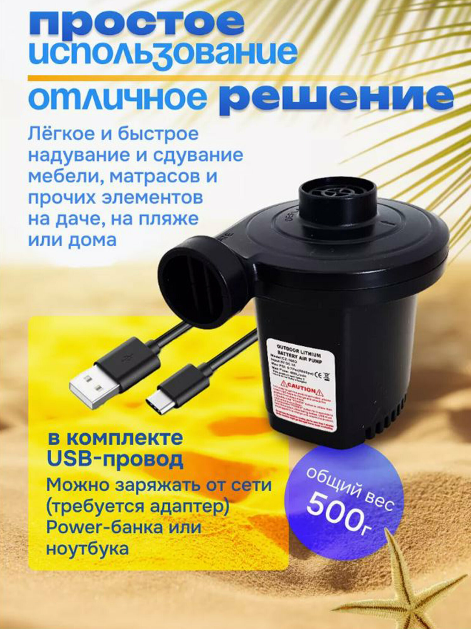 Электрический насос для надувной мебели это необходимая вещь для любого любителя кемпинга или отдыха на природе. Это универсальный , портативный электрический насос-качалка , который поставляется со шнуром usb type-c и тремя насадками для матрасов , лодок , бассейнов , автомобилей , надувных кругов и т. д. Этот насос идеально подходит для тех, кто любит исследовать природу и хочет быть уверенным, что их надувная мебель остается надутой. Так же данный насос имеет встроенную батарею, с этим удобством вам не придется тянуть шнур до предмета который надо накачать. Насос электрический универсальный ( портативный ) качок аккумуляторный для матраса , лодок с зарядное устройство и 3 насадки для матраса . Мощный воздуходув . ручной Давление: 4500 Pa Производительность: 400 л/мин.
