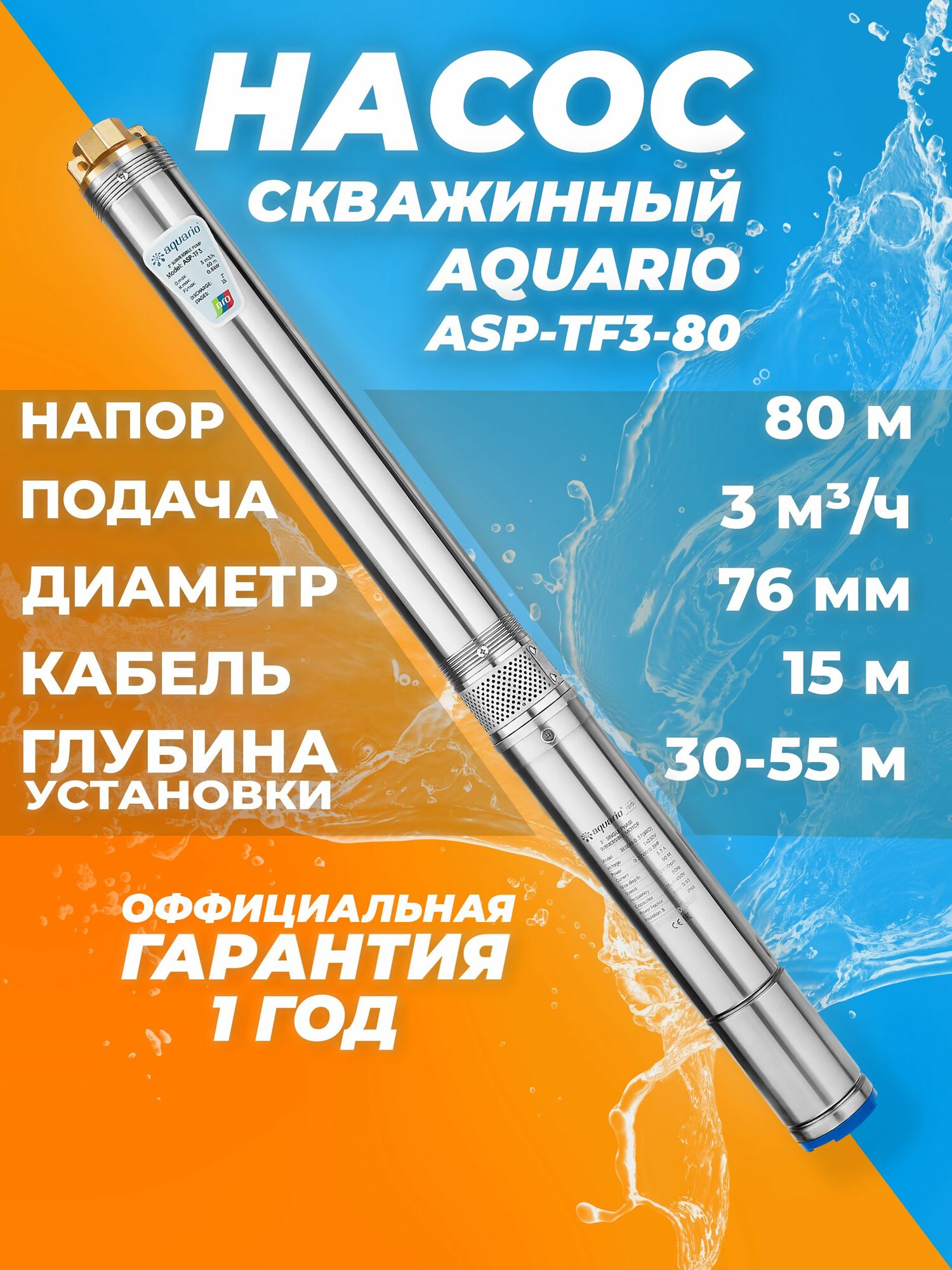 Насос для скважины (Aquario ASP-TF3-80 каб 15м. 3 м3/ч), насос скважинный глубинный, 30-55м, Акварио: сравнение цен, характеристики, фото, актуальное наличие и цены.