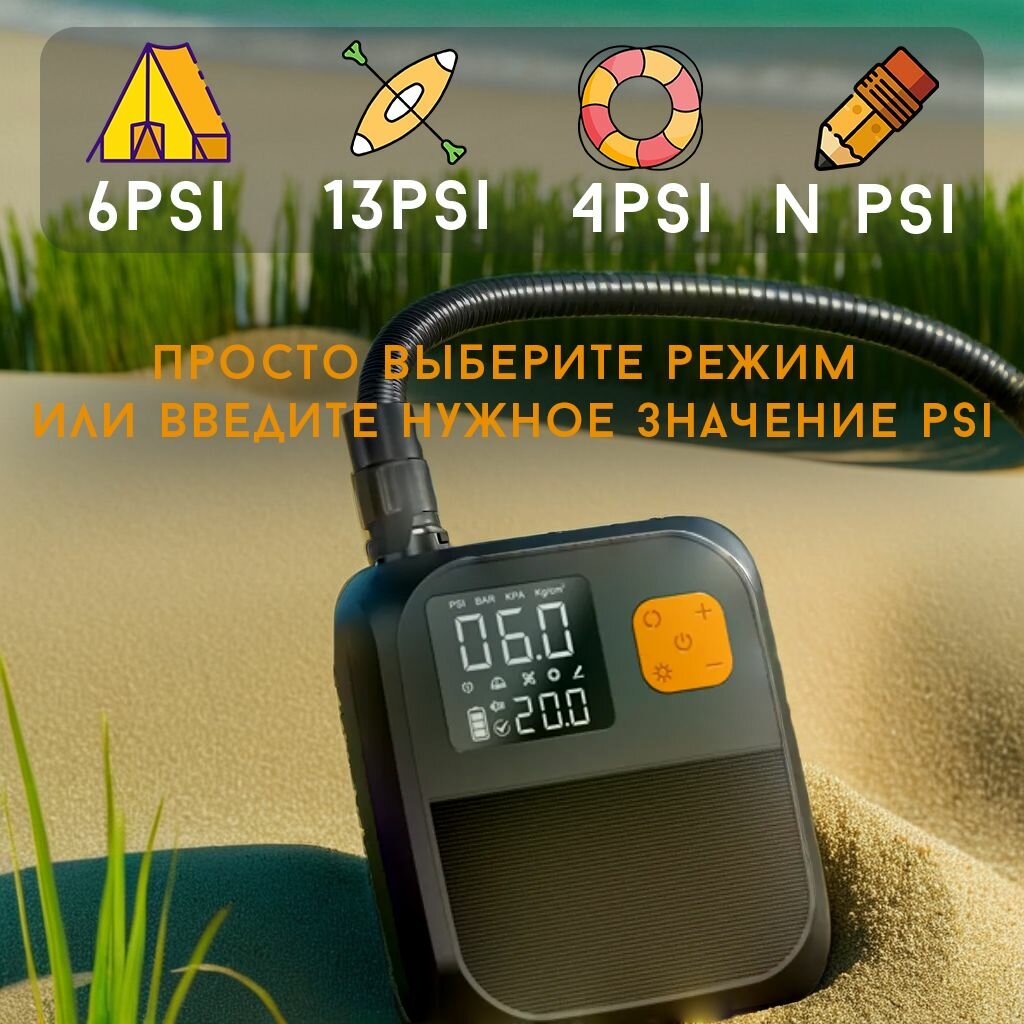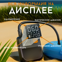 - 4 режима накачки. Насос оснащен 4-мя программными режимами для палатки, САП доски, кругов для плавания и пользовательским режимом. Режимы имеют разные параметры по давлению. Включив любой из этих режимов, аксессуар наполнится необходимым давлением и автоматически отключится, тем самым предотвратив чрезмерную накачку и обеспечив безопасность