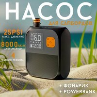 - Встроенный аккумулятор. Емкость аккумулятора 8000 мАч, что позволяет надуть ваш SUP в любом месте. Насос можно использовать как от встроенного аккумулятора так и от прикуривателя. Также насос можно использовать как Powerbank для зарядки вашего телефона. Среднее время зарядки насоса 4,5-5 часов