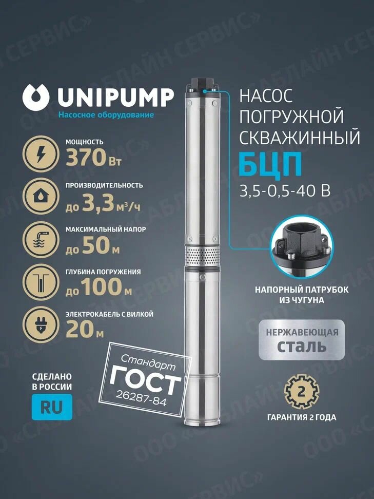 Насос для воды погружной скважинный UNIPUMP БЦП 3,5-0,5-40 В (370Вт; кабель 20м с вилкой): сравнение цен, характеристики, фото, актуальное наличие и цены.