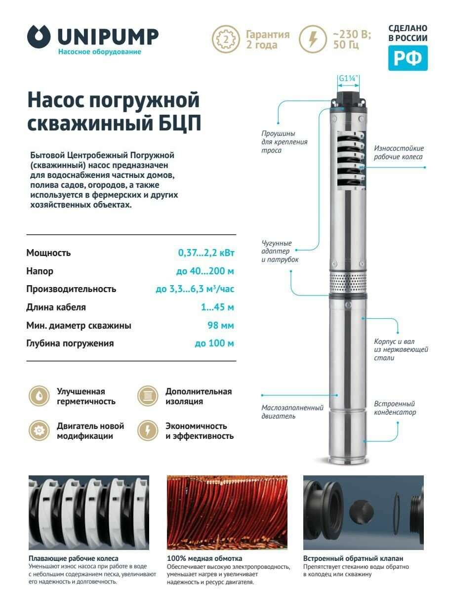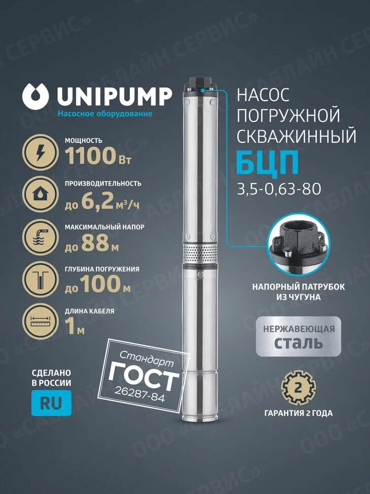 Насос для воды погружной скважинный UNIPUMP БЦП 3,5-0,63-80 (1100Вт, кабель 1м): сравнение цен, характеристики, фото, актуальное наличие и цены.
