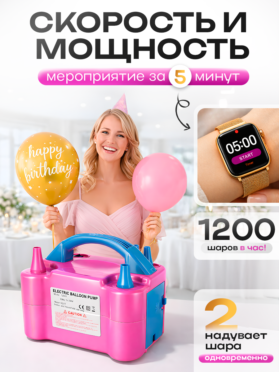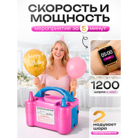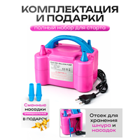 Электрический насос для воздушных шариков поможет быстро и просто надуть большое количество шаров всех типов: стандартные латексные или резиновые, фольгированные или фигурные. Компрессор незаменимый помощник аниматора на детский праздник, для оформления фотозоны на день рождения, свадьбы или выпускного вечера. Насос для шариков работает от сети 220В, длина провода 1 метр. Для компактного хранения и транспортировки провод можно убрать в специальный отсек. Баллонный насос обладает мощностью 600Вт, скорость подачи воздуха 400л/мин, он способен надуть воздушный шарик всего за 1-3 секунды (в зависимости от размера шара и желаемого результата). Также, благодаря двум воздушным выходам, можно надувать сразу 2 воздушных шарика одновременно. Диаметр насадки 12мм, также в комплекте идут 2 дополнительные насадки-переходники диаметром 9мм, таким образом можно надувать как большие, так и маленькие воздушные шарики. Насос электрический компрессор для воздушных шариков работает в двух режимах подачи воздуха – постоянный и импульсный (на синей насадке), при котором надувание шаров происходит в результате нажатия. После снятия шарика с клапана насос самостоятельно отключится. ! Обратите внимание! Во избежание перегревания насоса рекомендуемое время непрерывной работы 10 минут (в режиме импульсной работы 30 минут). Этого времени будет достаточно для надувания более 200 шариков. Не используйте электронасос в помещении с высокой влажностью, а также на улице во время дождя или снега. Аппарат для надувания шариков прост в использовании, компактный и имеет нескользящие ножки на корпусе. Размер компрессора для шариков всего 19,5*12,5*15 см, а вес 837 г. Быстрый и мощный электрический насос для надувания шаров станет незаменимым атрибутом для организации праздников, торжественных мероприятий и для оформления магазина или кафе.