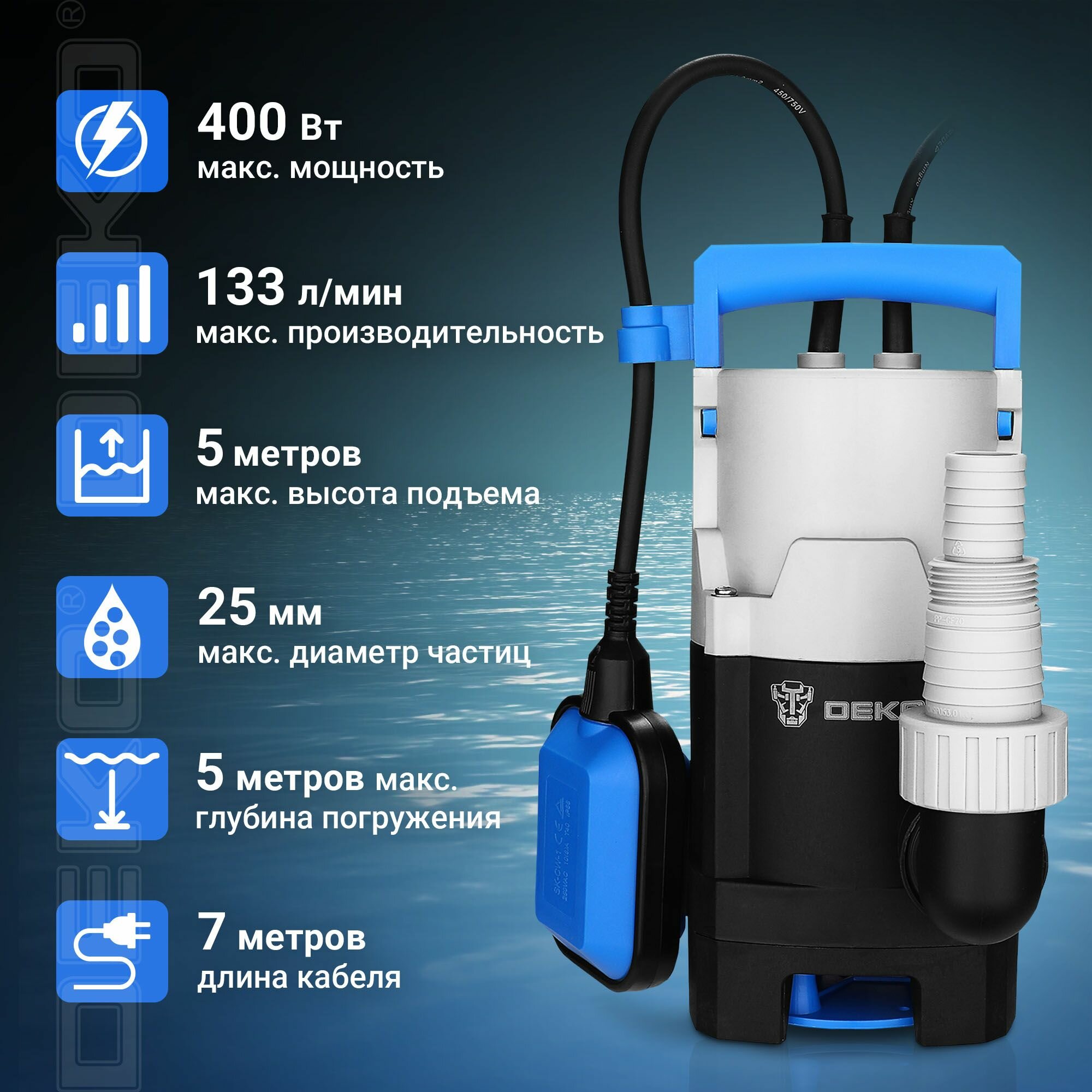 Технические характеристики: Напряжение/Частота: 220 В/50 гц Мощность: 400 Вт Производительность: 8000 л/ч (133 л/мин) Высота подъема: 5 м Глубина погружения: 5 м Диаметр пропускаемых частиц: 25 мм Остаточный уровень воды: 25 мм Материал корпуса: пластик Длина кабеля: 7 м