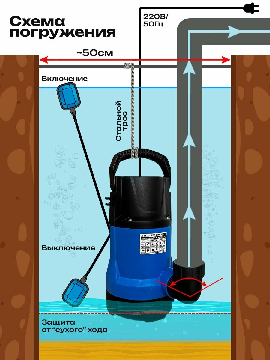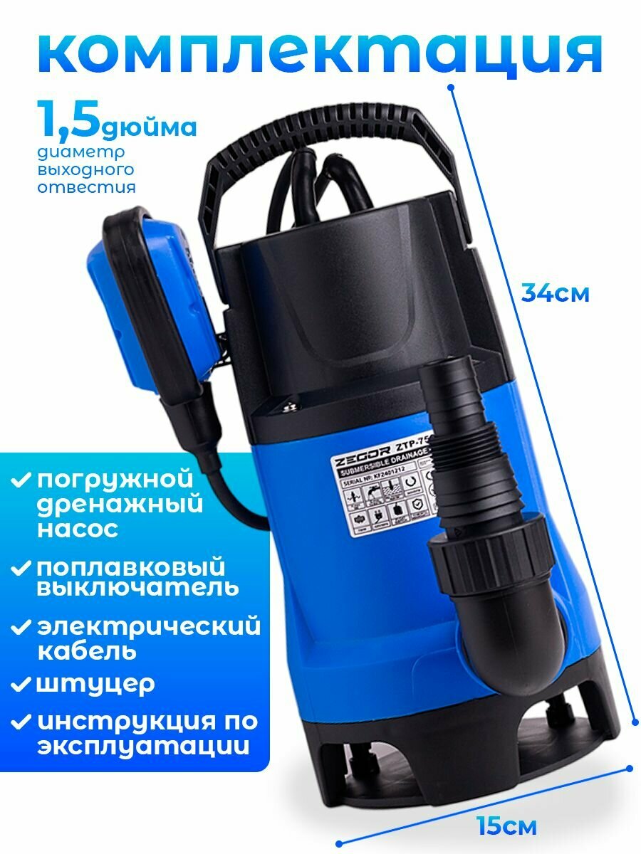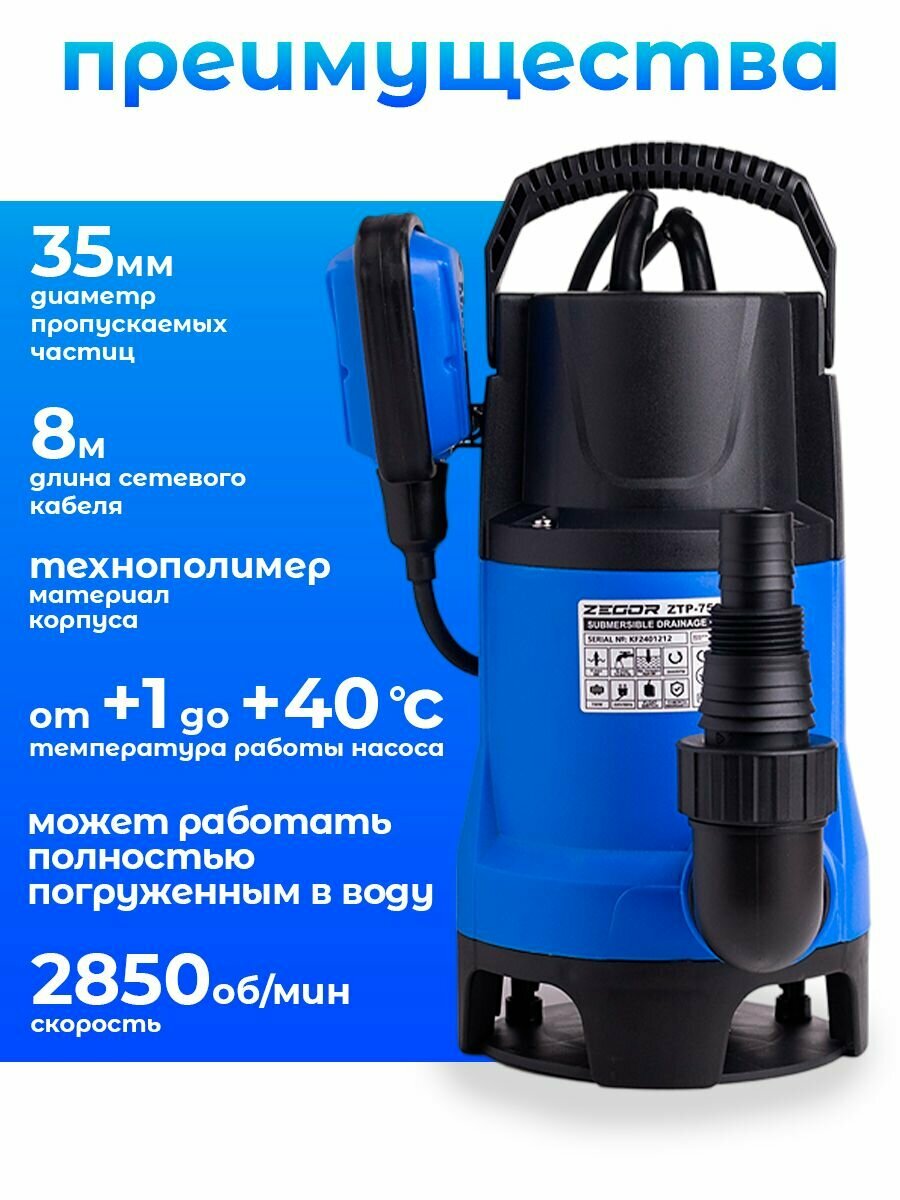 Купить Насос дренажный для грязной воды ZEGOR, 750Вт, погружной, 12 м³/ч, глубина погружения 5м, 8м напор с доставкой по всей России.