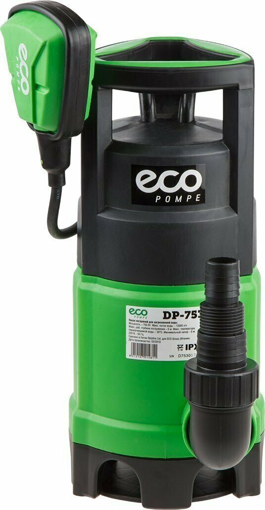 | Подробная комплектация | Погружной насос дренажный ECO DP-753, 750 Вт, 13000 л/ч, 9 м; универсальный патрубок с угловым коленом. |