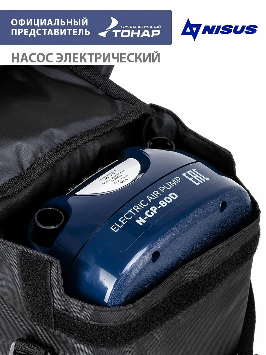 Электрический насос NISUS N-GP-80DДвухступенчатый электрический насос высокого давления N-GP-80 работает только от внешнего аккумулятора 12 В. Регулятор давления – электронный с встроенным манометром 0,1÷0,8 Bar с шагом 0, 05 Bar. Подходит для накачивания/сдувания надувных лодок ПВХ, РИБов, бассейнов, матрасов, аттракционов (в комплекте поставки – адаптер под вворачиваемый клапан и 9 переходников под воздушные клапаны различных диаметров).