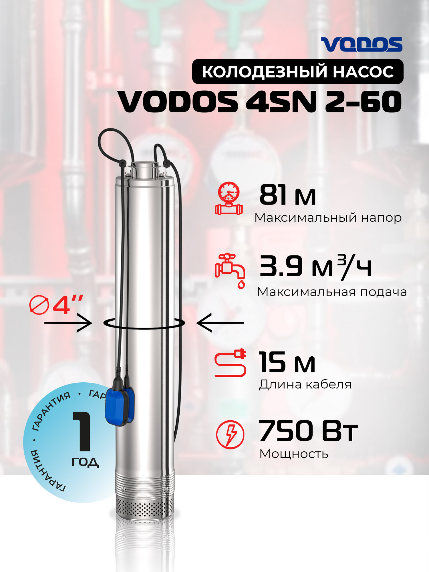 Купить Насос колодезный VODOS 4SN 2-60А с кабелем 15м, нержавеющая сталь с доставкой по всей России. Насос колодезный VODOS 4SN 2-60А с кабелем 15м, нержавеющая сталь: сравнение цен, характеристики, фото, актуальное наличие и цены.
