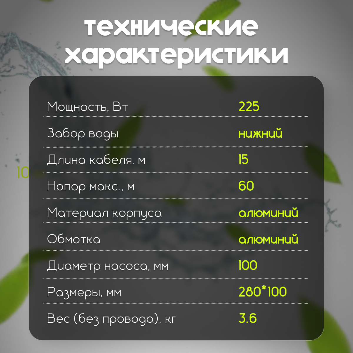 нижний забор воды; время непрерывной работы электронасоса не должно превышать 2 часов с последующим отключением на 15-20 мин и не более 12 часов в сутки; вес указан без учета веса шнура