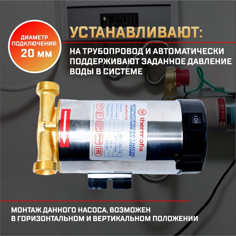 Купить Насос повышающий давление с сухим ротором Thermofix ВР-120-15 (0,12 кВт,25 л/мин напор 15м)/ автоматический насос повышения давления с доставкой по всей России. Насос повышающий давление с сухим ротором Thermofix ВР-120-15 (0,12 кВт,25 л/мин напор 15м)/ автоматический насос повышения давления: сравнение цен, характеристики, фото, актуальное наличие и цены.