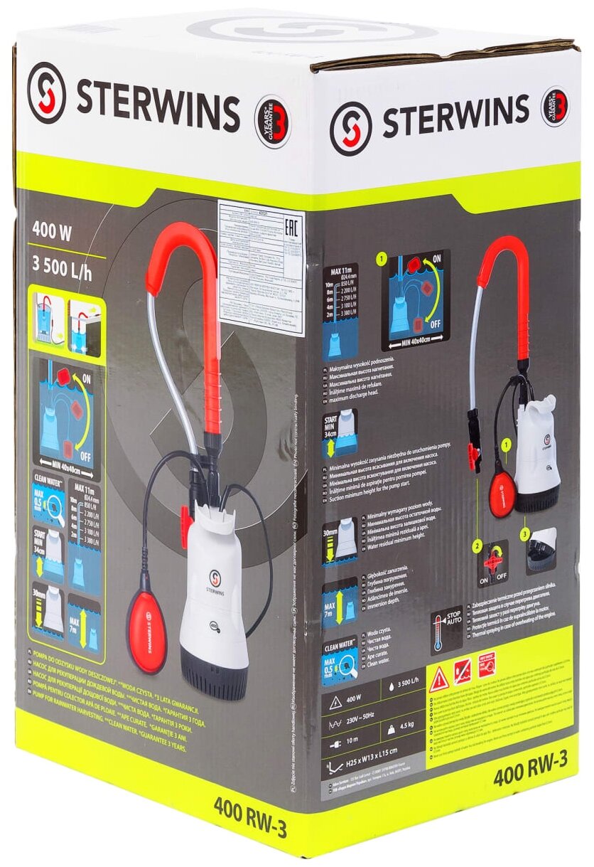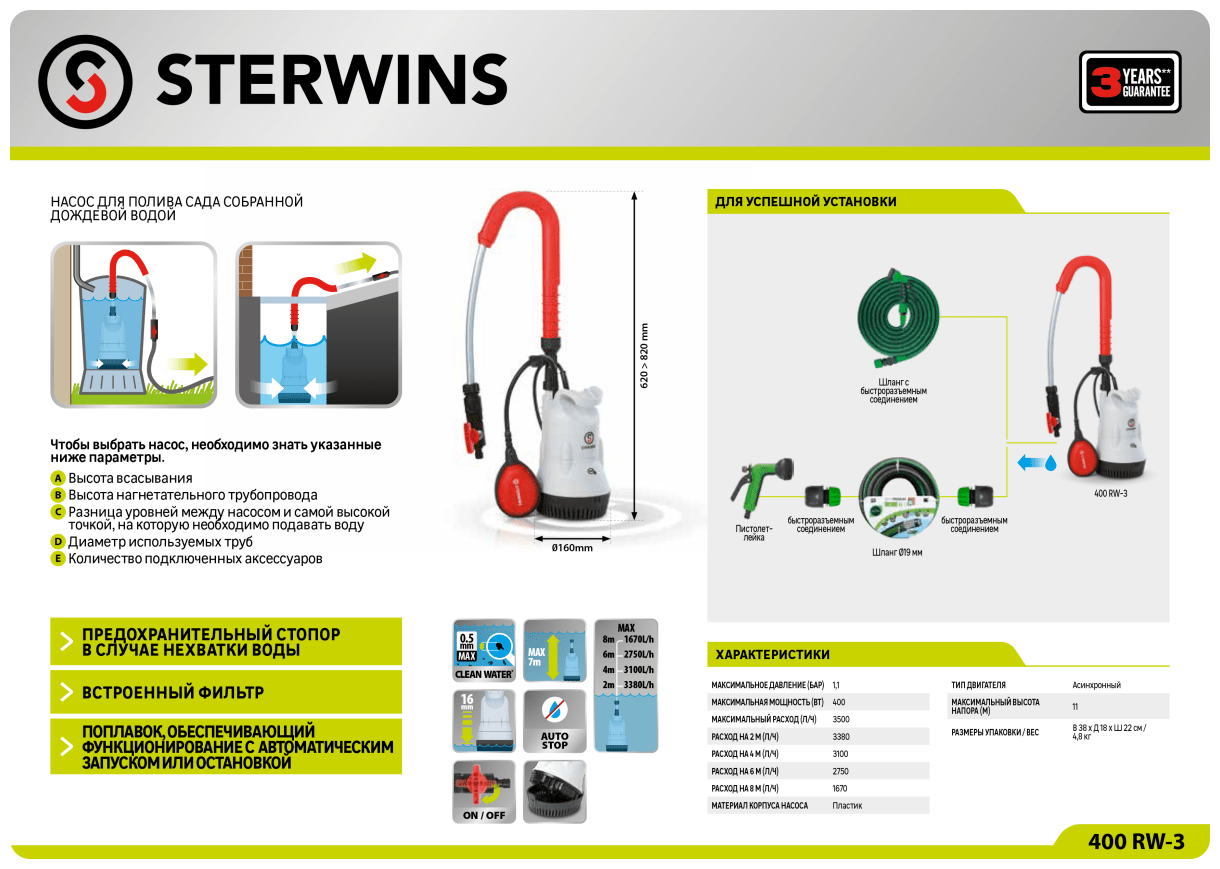 Насос для полива из бочки Sterwins RW-3 решает проблему орошения садовых и огородных участков при отсутствии центрального водоснабжения. Это одна из самых сбалансированных в своём классе моделей. Достаточно мощный для обработки участков средней площади, насос снабжён 10-метровым кабелем и отличается компактными размерами. Его также стоит купить, если требуется перекачивать воду из канистр и других резервуаров, в том числе из колодцев небольшой глубины. Преимущества: Максимальная температура воды (°С): 35 Встроенный измельчитель: Нет Цветовая палитра: Красный Страна производства: Китай Обратный клапан: Нет Максимальная глубина всасывания (м): 7 Высота подъема (м): 11 Встроенный поплавок: Нет Защита от сухого хода: Нет Максимальное давление (бар): 1.1 Соединительный патрубок в комплекте: Да Для откачки воды из бассейна: Нет Тип упаковки: Коробка Тип продукта: Откачивающий насос Тип жидкости: Чистая вода Гарантия (лет): 3 Мощность (Вт): 400 Максимальная мощность (Вт): 400 Максимальный расход (л/ч): 3500 Размер пропускаемых частиц (мм): 1 Диаметр патрубка (мм): 0 Вес, кг: 5.01 Длина сетевого кабеля (м): 10 Материал ротора: Литая сталь Материал корпуса насоса: Пластик Марка: STERWINS Применение продукта: Для чистой воды Давление (бар): 1.1 Глубина погружения (м): 7 Тип двигателя: Электрический Расход (м³ / ч): 3.5 Напряжение (В): 230 Степень защиты от пыли и воды (IP): IPx8 Конструкция насоса: Одноступенчатый