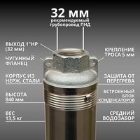 Погружной скважинный насос оснащен встроенным модулем пуска и термозащиты, электродвигатель маслозаполненный. Корпус выполнен из нержавеющей стали и характеризуется устойчивостью к внешним воздействиям. При монтаже через оголовок и подключении насоса к системам автоматики допускается срез вилки – это не приведет к снятию оборудования с гарантии.