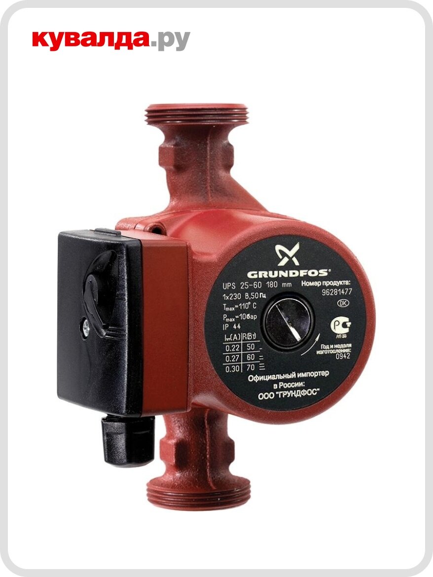 Циркуляционный насос Grundfos UPS 32-60 , оснащенный электродвигателем с мокрым ротором и защищенным статором, без сальниковых уплотнений, с двумя уплотнительными кольцами.