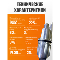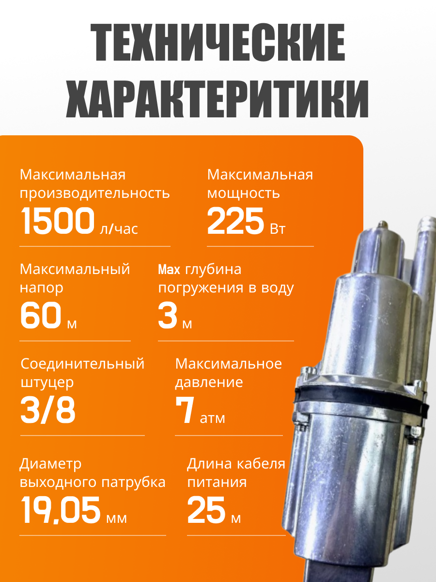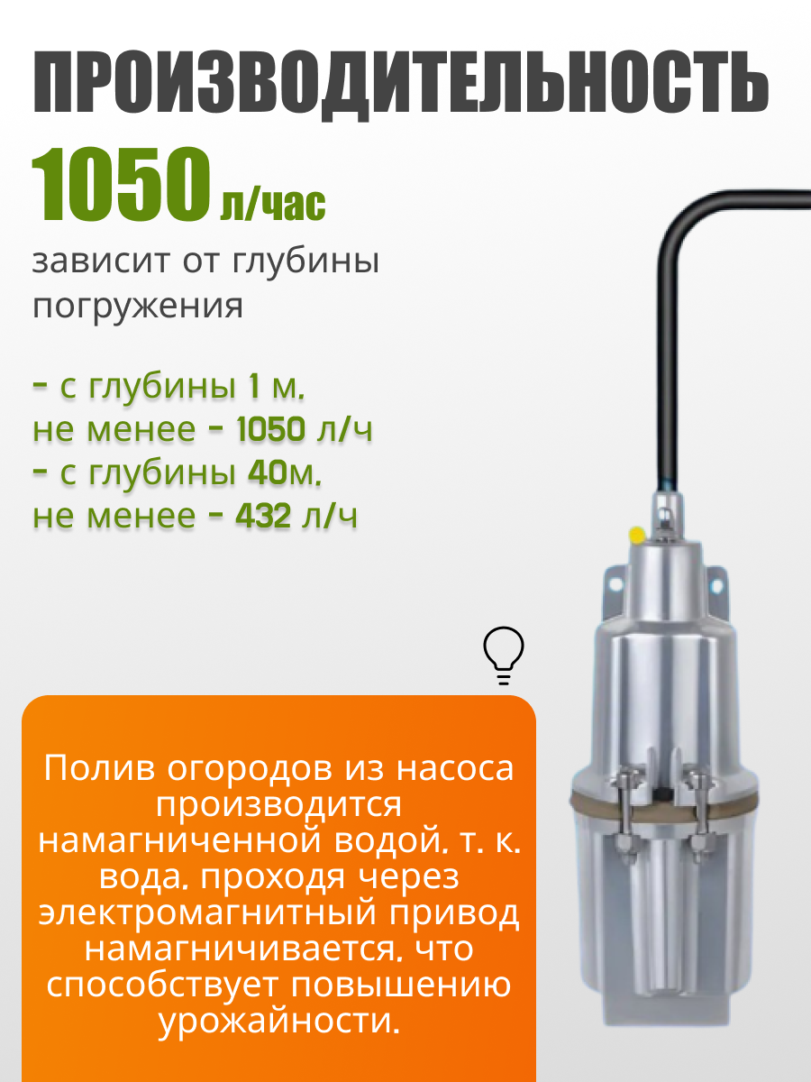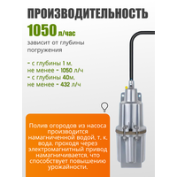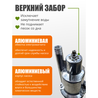 верхний забор воды; массовая доля механических примесей не более 0,01%; производительность: с глубины 1 м, не менее - 1050 л/час, с глубины 40м, не менее - 432 л/час; время непрерывной работы электронасоса не должно превышать 2 часов с последующим отключением на 15-20 мин и не более 12 часов в сутки; вес указан без учета веса шнура