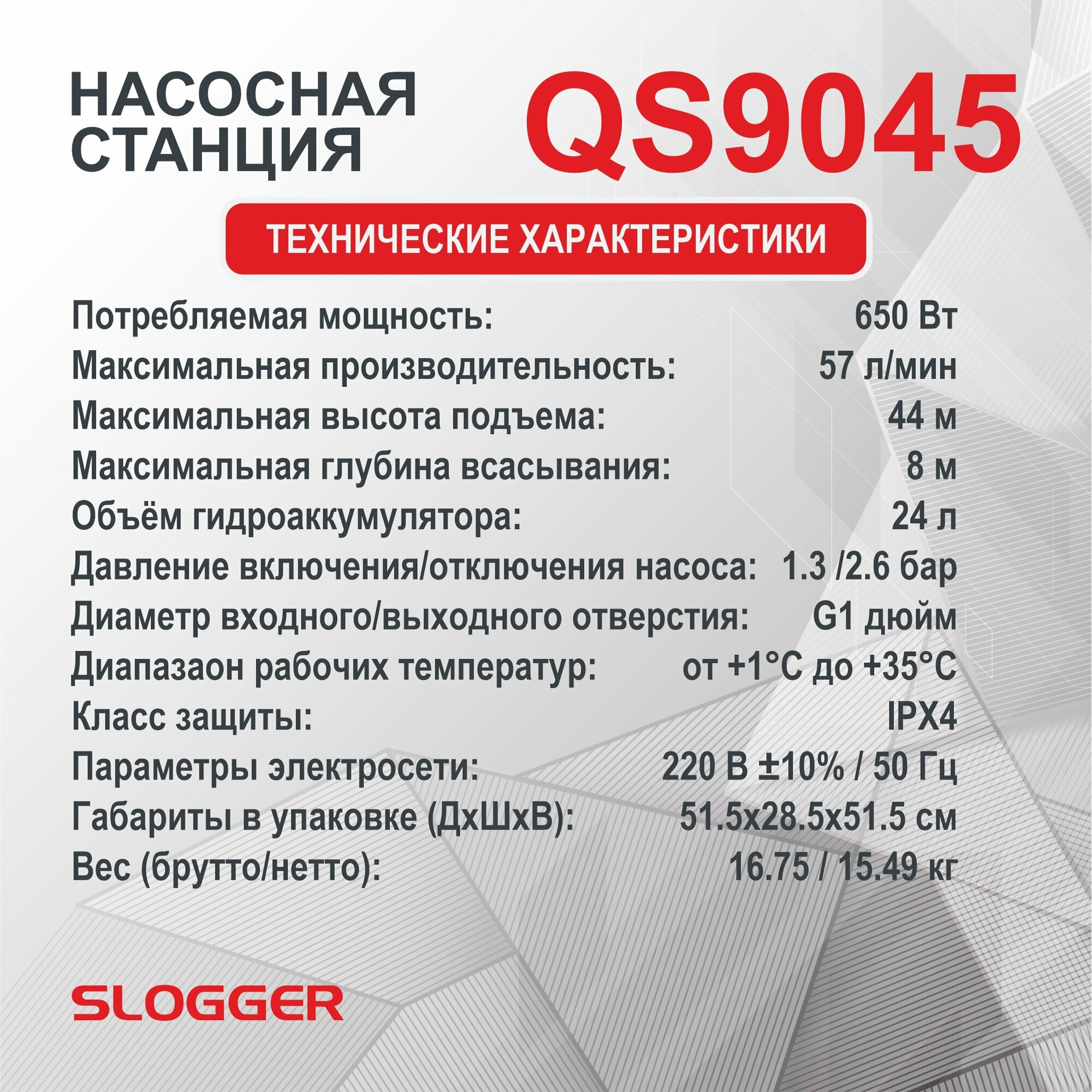 Насосная станция SLOGGER QS9045 - это высококачественное оборудование для бытового водоснабжения. Производительность насоса составляет 57 л/мин, а мощность - 650 Вт.