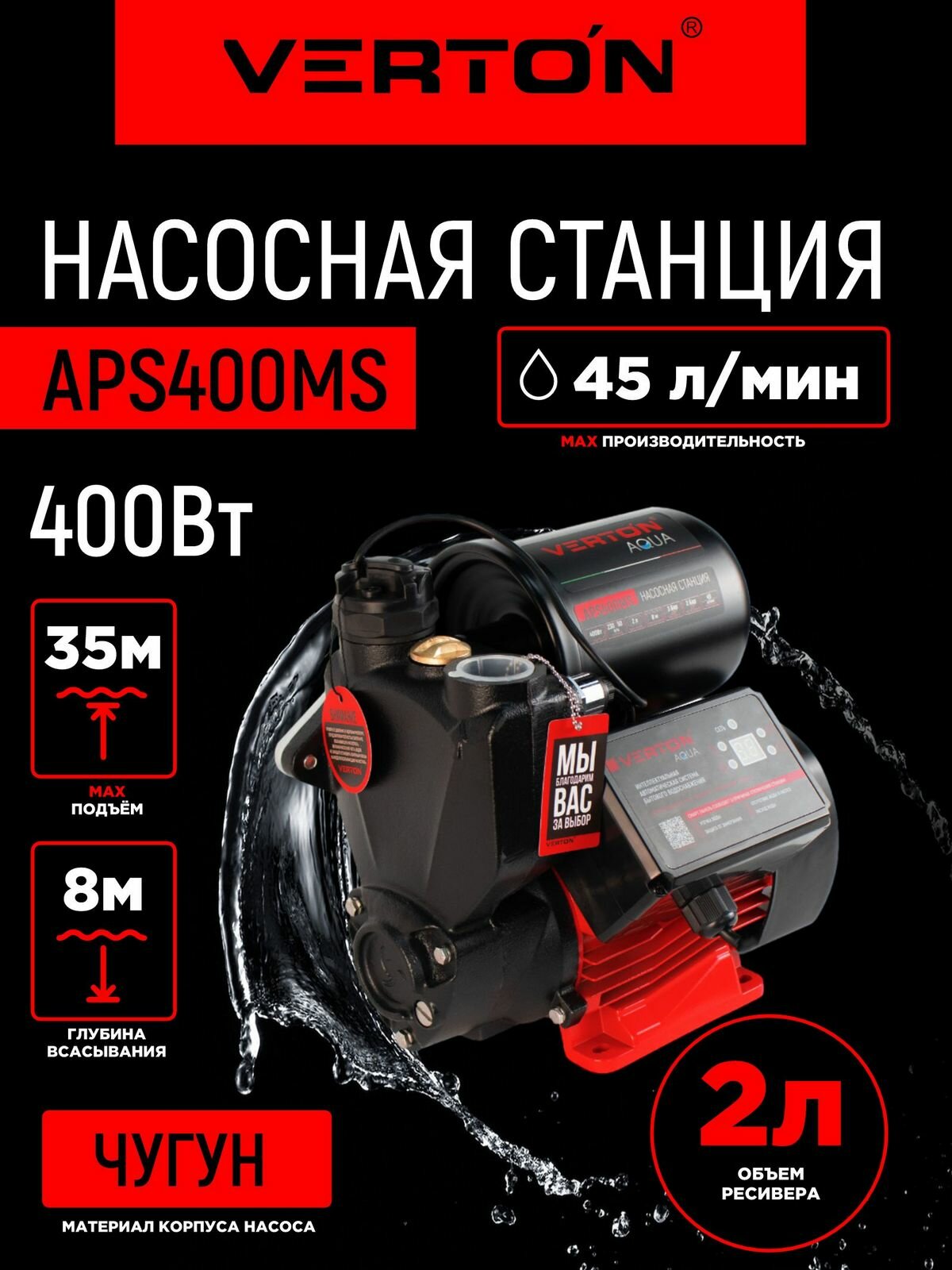 Купить Насосная станция Verton AQUA APS400MS (400Вт, 43л/мин, 2л, гл. 8м, H 35м, вых. 1″, 1.5 бар, дисплей) с доставкой по всей России. Насосная станция Verton AQUA APS400MS (400Вт, 43л/мин, 2л, гл. 8м, H 35м, вых. 1″, 1.5 бар, дисплей): сравнение цен, характеристики, фото, актуальное наличие и цены.