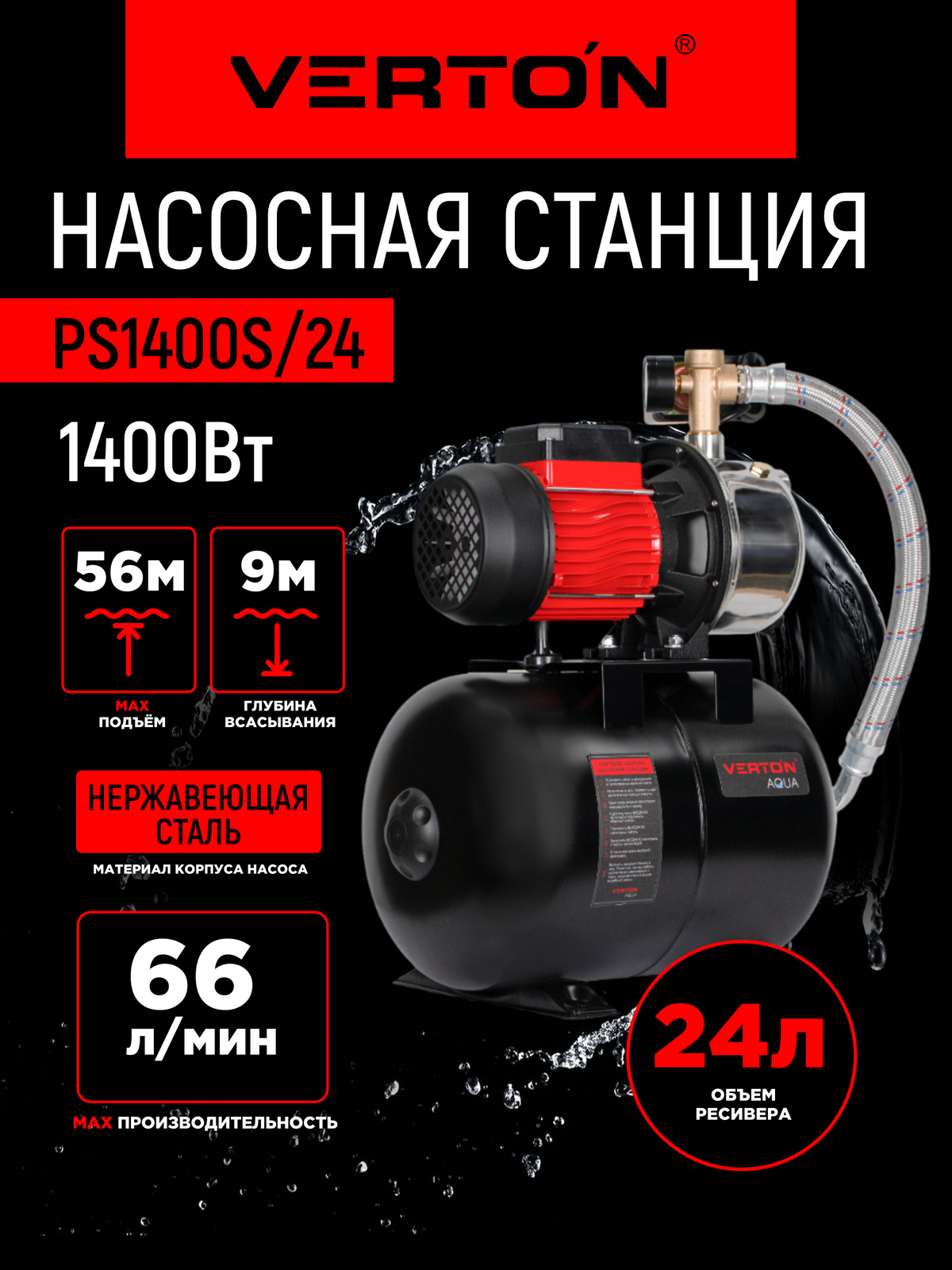 Насосная станция Verton AQUA PS1400S/24 (1400Вт, 66л/мин, 24л, гл. 9м, h 56м, вых. 1/32″, 3 бар): сравнение цен, характеристики, фото, актуальное наличие и цены.