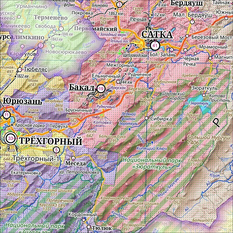 Карта отображает современное (январь 2024 г.) административно-территориальное устройство Челябинской области: