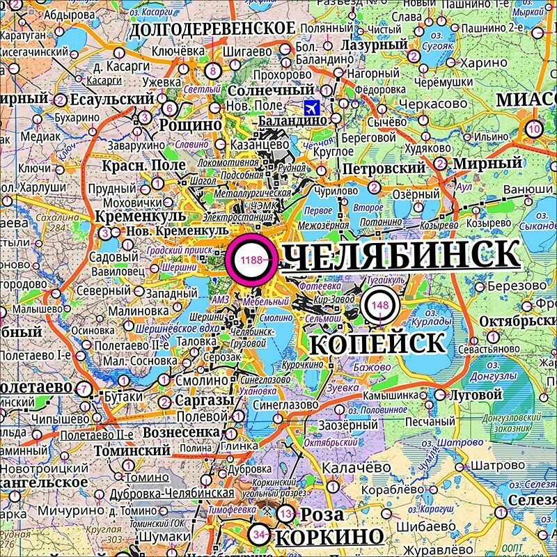 Административная карта Челябинской области 176 х 150 см, отпечатана на интерьерном баннере, материал устойчив к воде, не рвется, не мнется. Масштаб 1 : 300 000 (в 1 см 3 км).