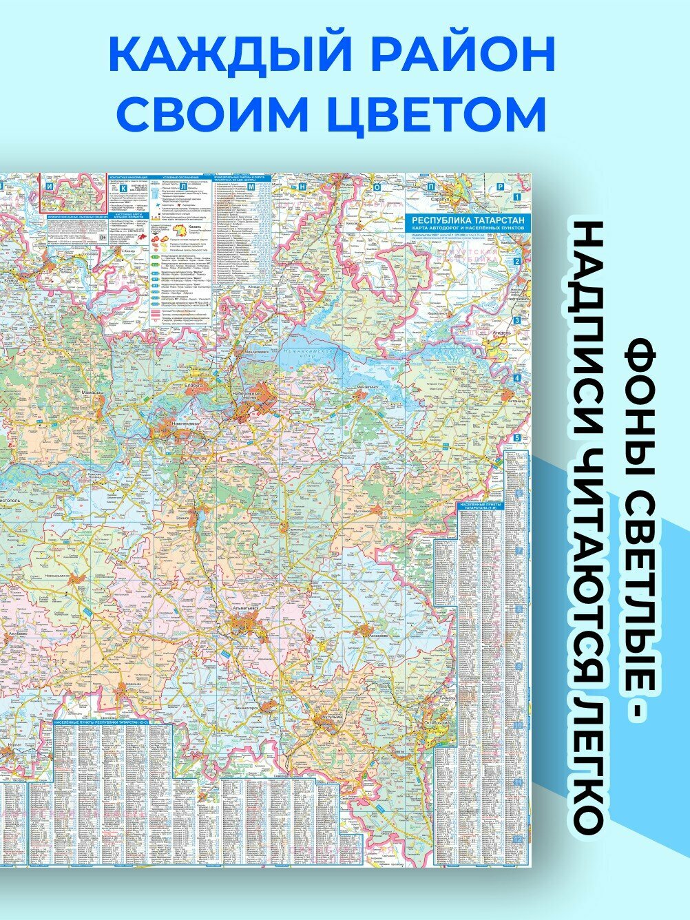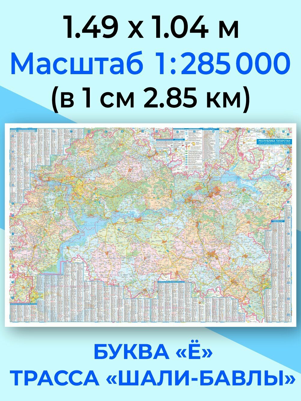 Карта имеет крупный масштаб (1:285 000, в 1 см 2.85 км), содержит алфавитный указатель всех 3119 населённых пунктов Республики Татарстан. Надписи выполнены с использованием буквы "Ё" (согласно нормам русского языка). На карте обозначены все строящиеся дороги, расстояния между населёнными пунктами и перекрёстками дорог. Настенную карту можно разместить дома, в рабочем офисе или подарить родным, друзьям, коллеге, начальнику.