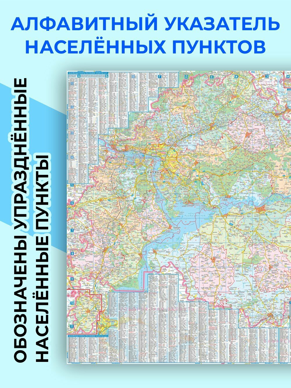 На карте присутствуют хорошо различимая координатная сетка с крупными буквами/цифрами, алфавитный указатель всех 3119 населённых пунктов Татарстана (некоторые - в 2-3 вариантах написания), а также упразднённых населённых пунктов (своим цветом).