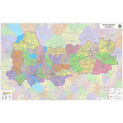 Административная карта Вологодской области 123 х 193 см, отпечатана на самоклеющейся плёнке, при необходимости её можно наклеить на твердую основу (пластик, металл, дерево). Масштаб 1 : 400 000 (в 1 см 4 км).
