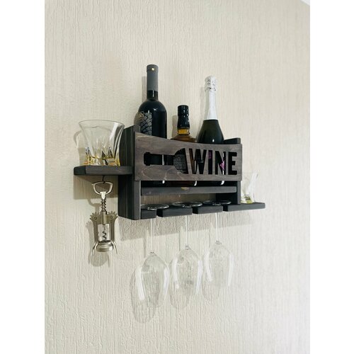 Сообразим на троих? Новинка в нашей линейке баров. Настенная полка - компактная, при этом вместительная и универсальная. В ней помещаются не менее трех бутылок, бокалы для вина/ виски/пива и любых других напитков, различные аксессуары и прочие декоративные вещицы. Что бы все необходимое было под рукой, мы предусмотрели место для подвешивания штопора (в комплекте штопор не идет). Эта стильная винная полка сделана из натурального дерева, покрыта морилкой, надежно защищена лаком. Держатель для бутылок приятно преподнести в подарок себе, близким и друзьям на любой праздник. Благодаря необычному дизайну, полка украсит любой интерьер. Барная полка отправляется полностью в собранном виде, надежно упаковывается в транспортировочный короб. Приятных покупок!