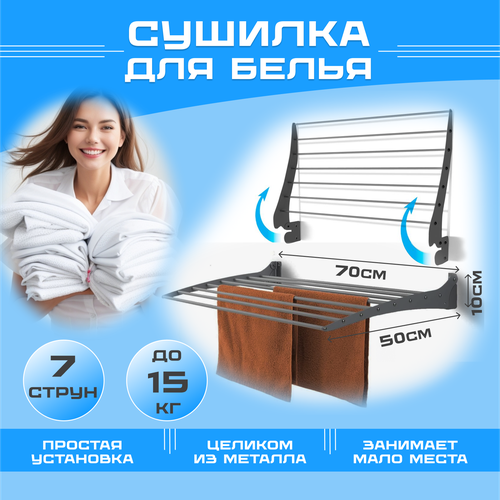 Настенная складная выдвижная сушилка для белья. Разместить можно на балконе и в ванной над батареей. Крепкая компактная современная конструкция из стали с алюминиевыми струнами. Инновационная настенная раздвижная сушилка для белья Lebensart Rome не занимает место, отлично вписывается в современный интерьер с классическим, современным минималистичным дизайном. Складная сушилка экономит место в ванной, на балконе, лоджии, над батареей и радиатором, а также высушит вещи без складок и заломов. Он проста в использовании. Ширина составляет 70 см, длина выдвижной части 50 см, вешалка имеет 7 прочных выдвижных прутьев. Вместит на себя полную загрузку стиральной машинки и выдерживает нагрузку в 15 кг. Стильная, практичная и компактная впишется в любой интерьер и декор экономит место в доме в квартире в ванной на балконе лоджии над батареей и радиатором. Отлично подойдет для прачечной ванны кухни комнаты балкона под батарею в небольших помещениях, за шторы. Данная конструкция отличается от других бельевых встраиваемых сушилок плавным и бесшумным механизмом. Данный аксессуар выполнен из качественного металла и станет отличным подарком на любой праздник, маме, сестре, бабушке или подруге. Она удобнее и практичнее чем потолочная, веревочная гармошка. Позволяет хозяйке сэкономить большое количество пространства, не требует прикладывания усилий при раскладывании и складывании. Выдвижной складывающийся механизм без веревок позволяет установить на стену в удобное место, будь то спальня, детская или гостиная. Устойчивая раскладная встраиваемая сушка крепится на 4 дюбель гвоздя, которые идут в комплекте. Установка быстрая и простая. Полотенце держатель помогут разместить вещи и обувь. Раздвижной держатель для одежды выглядит эстетично и практично в интерьере, без веревок и лески. Настенная сушилка трансформер для белья и одежды идеальный и незаменимый помощник для организации пространства в доме.