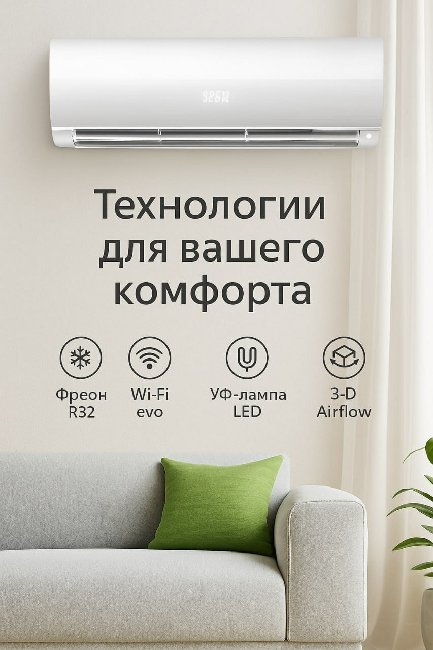 пульт ДУ, регулировка направления воздушного потока, таймер включения/выключения, управление со смартфона