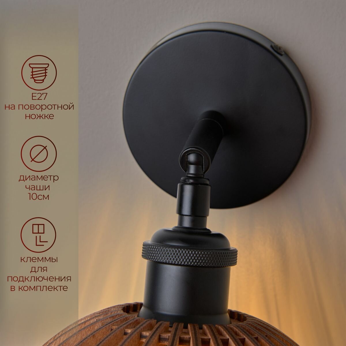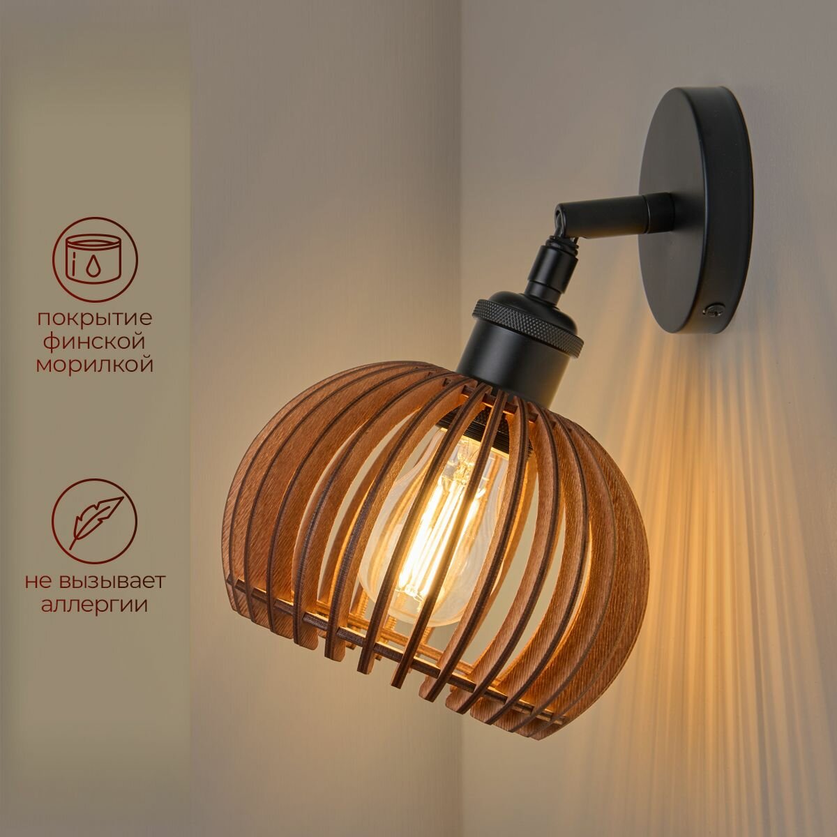 Настенный светильник изготовлен из натурального, экологически чистого дерева — березовой фанеры. При изготовлении используется покрытие высокого качества, что обеспечивает долгий срок службы. Также оно не имеет запаха, и обладает гипоаллергенными свойствами, делая использование более комфортным. Деревянный плафон имеет следующие габаритные размеры: диаметр 17 см, высота 12 см, диаметр основания 10 см. Светильник поставляется в собранном виде, а значит вам не понадобится изучать сложные схемы и тратить время на сборку. На плафон уже установлен металлический патрон E27 на поворотной ножке, совместимый с большинством доступных лампочек. Направление плафона может регулироваться. Вся фурнитура исполнена в стильном черном цвете, патрон имеет матовое покрытие. Повесить светильник не составит труда, в комплекте уже предусмотрена планка для размещения как на стене, так и на потолке. Площадь освещения до 10 кв. м. Яркость будет зависеть от установленной лампочки, мы рекомендуем использовать светодиодные лампы или «лампы Эдисона». Обратите, пожалуйста, внимание, лампочка в комплект не входит. Перед изготовлением абажура весь древесный материал проходит несколько стадий обработки и идеально шлифуется, чтобы исключить появление неровностей и образование заноз, придать гладкую форму всем деталям. Бра изготовлено из высококлассной березовой фанеры толщиной 4 мм, что придает ей природный и теплый вид. Минималистичный эко дизайн подчеркнет плавные линии или же создаст строгую геометрию в вашем интерьере, в зависимости от выбранной модели. Цвет патрона и мягкий свет лампочки создают элегантный и уютный внешний вид. Интерьерные светильники — это эффективный способ расставить световой акцент в вашей кухне, прихожей, гостиной, спальне или детской. Подойдет для дополнительного освещения над барной, кухонной зоной или на балконе. Создаст уютную и теплую атмосферу в вашей квартире или на даче. Отлично подойдет для любого помещения в загородном доме, от коридора до бильярдной, впишется в любой дачный интерьер. Заказывая несколько штук, вы легко создадите световые акценты и в коммерческих помещениях, будь то офис, кафе, ресторан или салон красоты. Кроме того, это отличный подарок для друзей, родных и близких, которые ценят красивый и функциональный дизайн. C Заботой о Вас и о Вашем Освещении, Brillight.