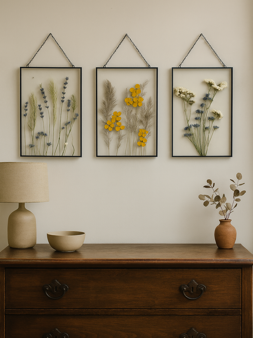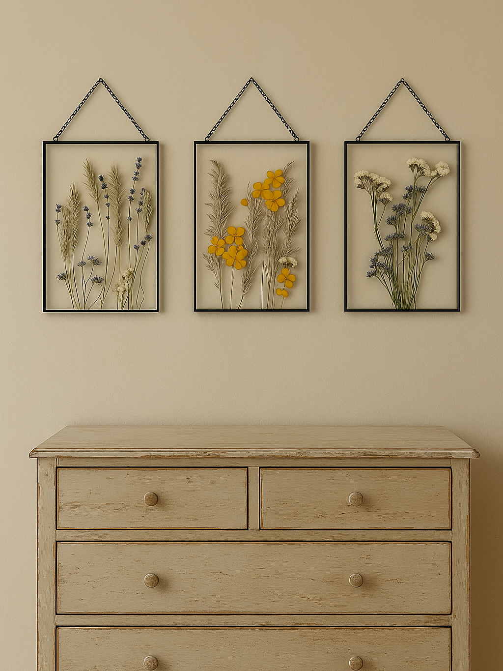 Три элегантных стеклянных панно с настоящими засушенными цветами и злаками, оформленные в тонких чёрных металлических рамах — изящное решение для декора кухни, столовой или зоны завтраков. Каждый цветок собран вручную, высушен и зафиксирован между прозрачными стеклами, что придаёт композиции лёгкость и воздушность.