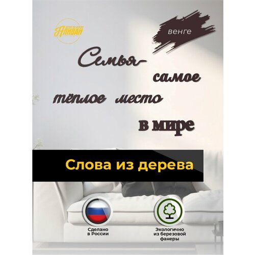 Панно на стену в виде слов "Семья - самое теплое место в мире". Надписи на стену изготовлены из березовой фанеры высшего сорта. Толщина каждого слова 3 мм. Декор для комнаты состоит из отдельных элементов, которые размещаются на стену и образуют целостное панно - декоративную надпись. Слова из дерева приклеиваются на стену термопистолетом или клеем жидкие гвозди (в комплект не входят). Настенная декорация изготовлена из дерева, это не интерьерные наклейки, а объемный 3d декор. Многоразовый декор, который прослужит вам долгие годы. Декорация на стену – это современный декор для кухни, декор для спальни, в гостиную. Надписи на стену для декора помогут обновить интерьер, скрыть небольшие повреждения или дефекты на стене и добавят уюта в ваш дом. Оформление стены вместо настенного постера, картины. Этот банер из слов идеально подходит для оформления стены в прихожей, стены в гостиной, стен в спальне, детской комнате, над кроватью и над подголовником кровати, в гардеробной комнате, в офисе. Интерьерное панно это прекрасная замена картинам по номерам, постерам, плакатам. Мотивирующие цитаты на стену тренд 2025 в дизайне интерьера. Вы можете выбрать надпись, которая отражает вашу личность или важные события в вашей жизни. Стильные и эстетичные предметы интерьера станут настоящим украшением вашей комнаты. Надписи на стену - это отличный способ выразить свои мысли и чувства. Декор из дерева станет отличной идеей подарка для ваших близких и родных. Приятный подарок молодоженам на годовщину свадьбы, подарок маме, папе, бабушке, дедушке, другу, подруге, брату, сестре на новый год, день рождения, юбилей, свадьбу, на новоселье и любой другой праздник. Деревянные надписи можно снять со стены и приклеить обратно, например во время ремонта. Поэтому мы считаем, что это многоразовый декор. Слова из дерева можно использовать для семейной фотосессии, свадебной фотосессии или для фото с детьми и друзьями. Многоразовые объемные стикеры из дерева помогут организовать дизайн свадьбы, вечеринки или фотосессии на день рождения (фотозона, фотофон). Современное и модное панно на стену станет удачным штрихом в завершении ремонта, сделает новоселье ещё более радостным или освежит уже привычный интерьер. При желании к настенной декорации можно добавить фоторамки в том же стиле и цвете. У вас получится настенный фотоколлаж из ваших фото. Для выбора и заказа фоторамок переходите на страницу нашего бренда, кликнув на логотип. Там же вы можете выбрать подарки и сувениры из дерева: салфетницы настольные, новогодние игрушки, ключницы и многое другое. 3D панно из слов - идеальное решение для тех, кто хочет преобразить свой интерьер быстро и недорого. Представленные цвета надписей подойдут для любого покрытия ваших стен. Будь то белая однотонная стена, цветные обои, декоративная штукатурка. Деревянная надпись в стиле лофт, так же подойдет для украшения кафе, салона красоты, офиса и других помещений.