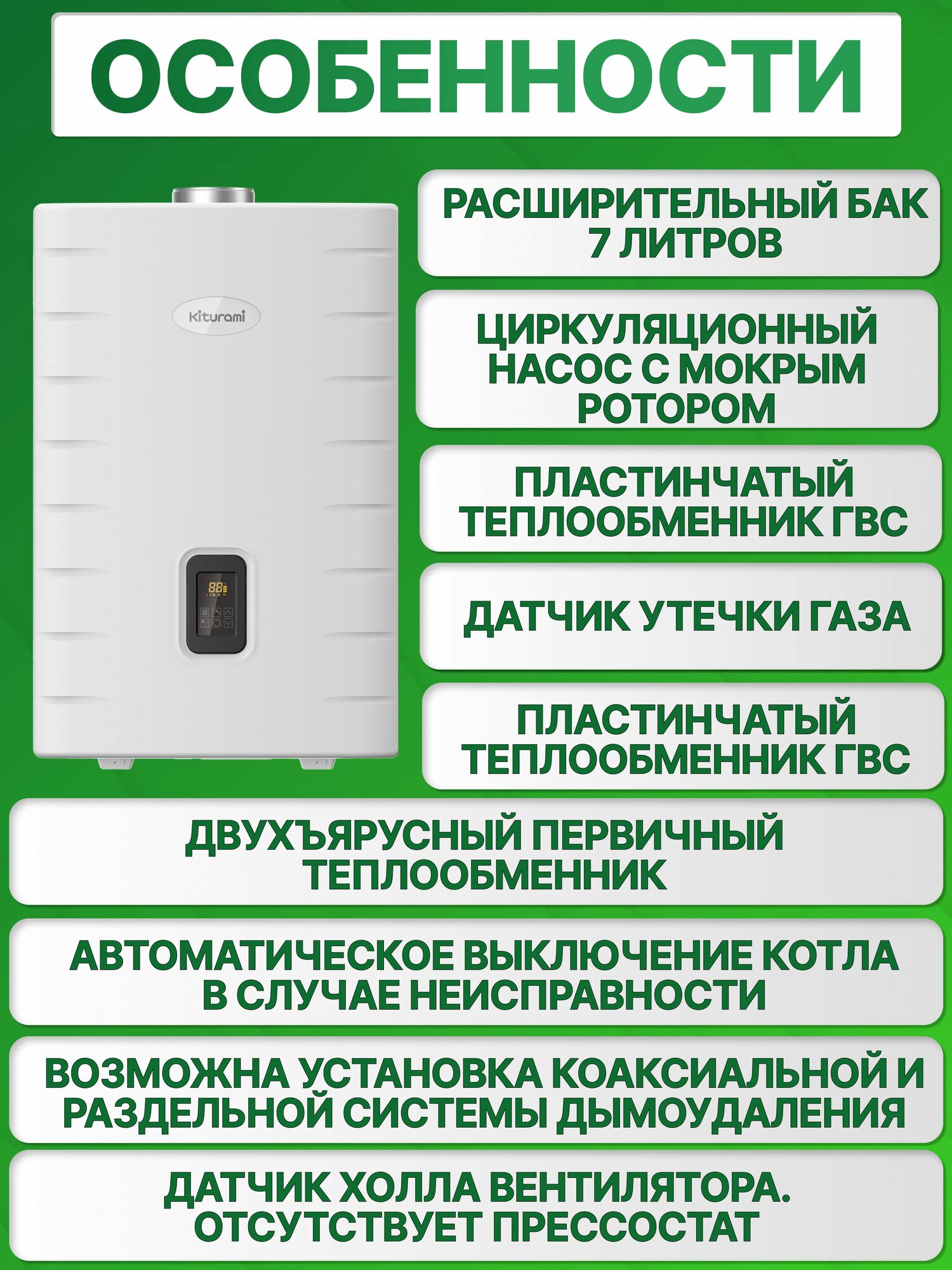 Основной теплообменник из нержавеющей стали обеспечивает защиту от конденсата и долговечную работу. Двухслойная конструкция гарантирует максимально эффективный теплосъем и экономичность.
