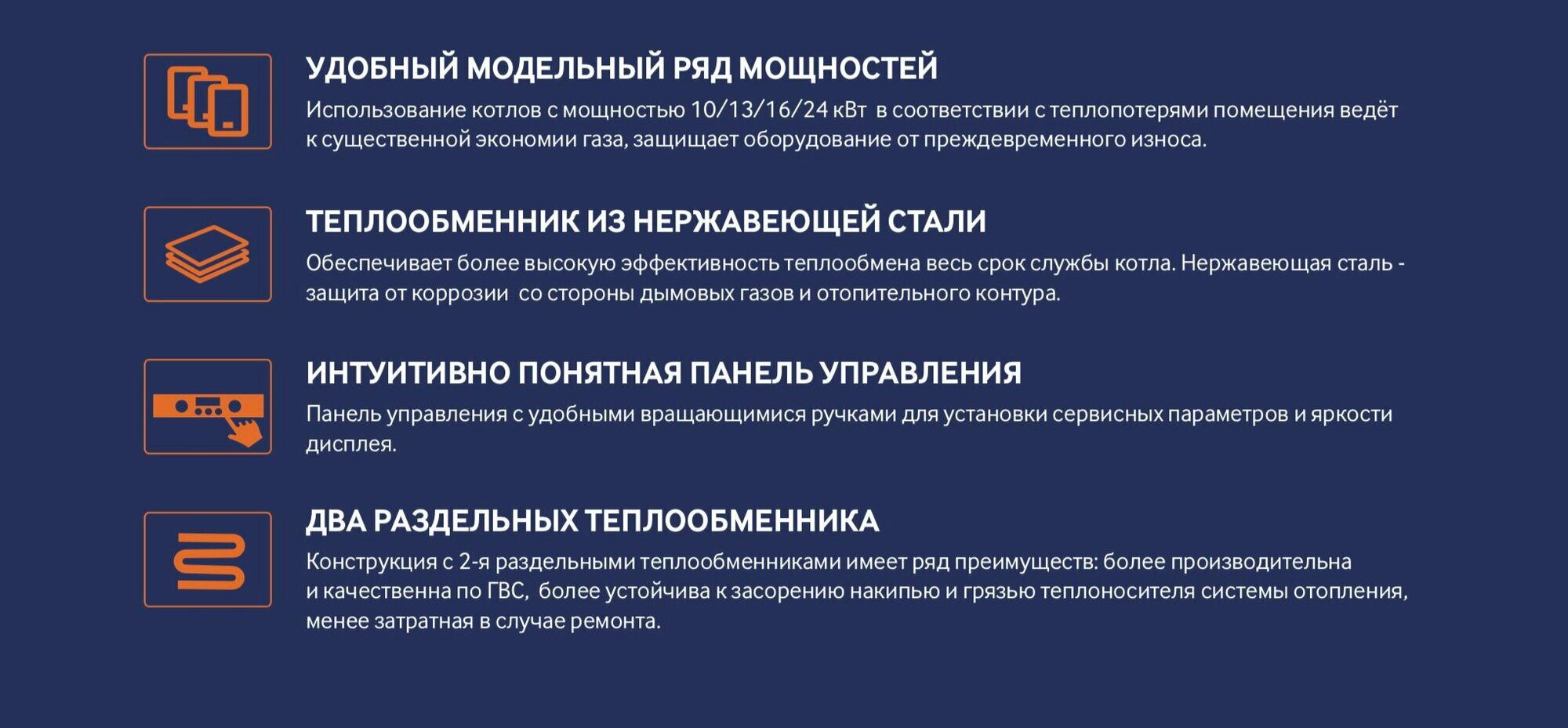- Вторичный теплообменник из нержавеющей стали обеспечивает высокую производительность ГВС 13,2 л/мин при ΔT=25 °С
