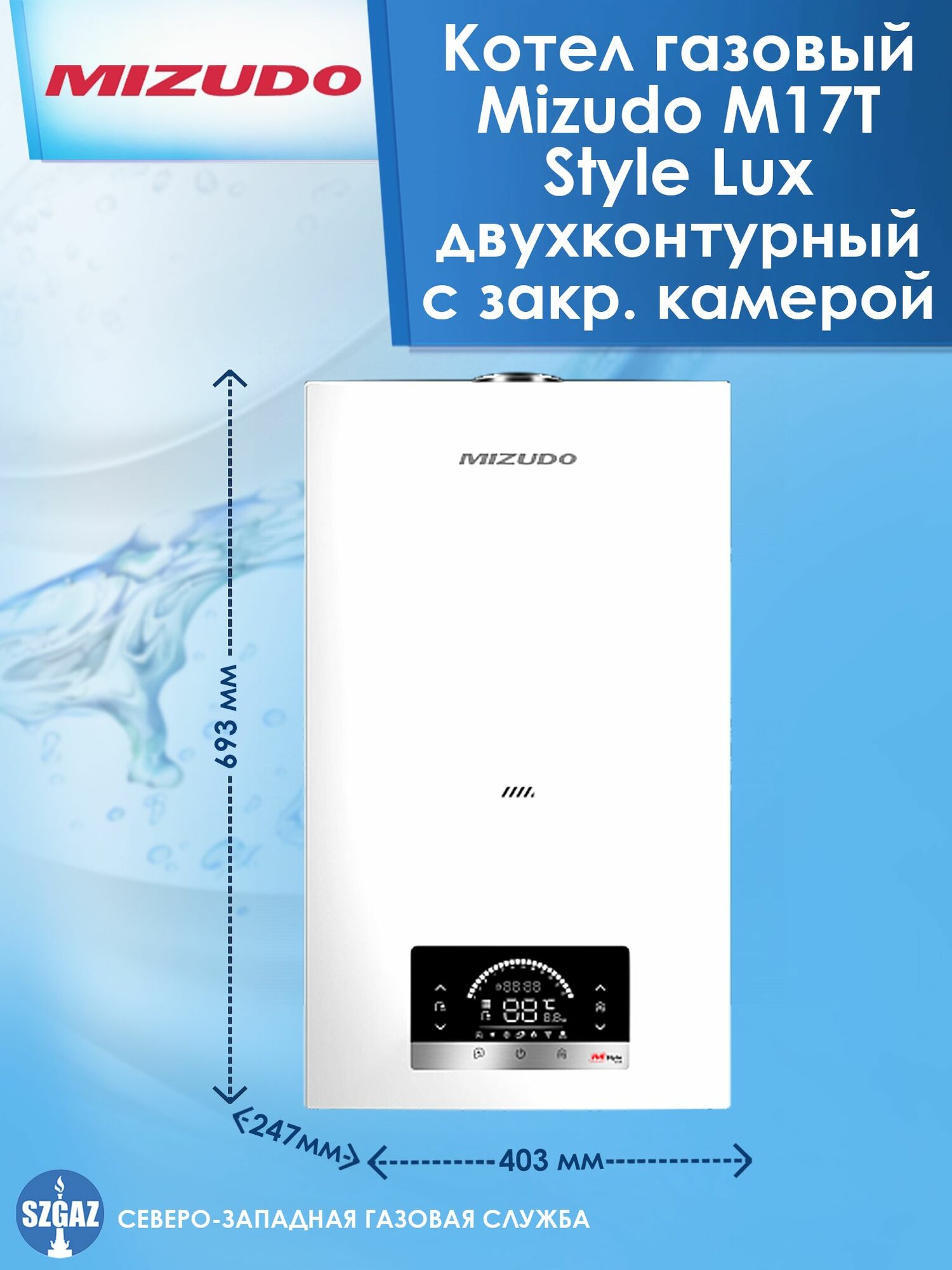 Купить Настенный котел газовый MIZUDO M17T Style Lux Wi-Fi, двухконтурный газовый котел Мизудо с закрытой камерой сгорания с шиной OpenTherm с доставкой по всей России.