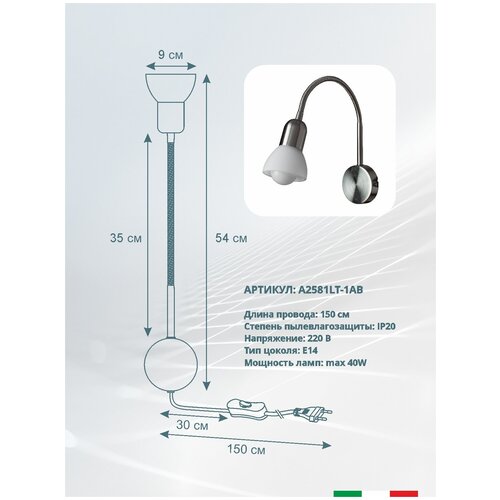 Спот Arte Lamp A3116AP-1SS серии FALENA, страна происхождения изготовителя – Италия. Внушительные размеры спота придают интерьеру представительный вид. Конусная форма и светлый оттенок спота добавляют помещению свободы. Металл является наиболее технологичным и долговечным материалом для изготовления арматуры. Комбинация из серебристого и матового цветов арматуры также подчеркивает особый характер дизайна. Сочетание серебристого цвета и необычной конусной формы плафона дизайн спота выглядит самодостаточным и сбалансированным. Выключатель \"на проводе\" является наиболее оптимальным для такого типа спота. На товар распространяется гарантия 12 месяцев.