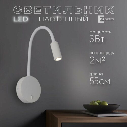 Светильник Zortes NIKKY в белом цвете станет стильным решением для лофт-пространств или современных интерьеров. Мощность 3 Вт формирует умеренно яркий свет (4000K), а гибкая стойка (550 мм) позволяет индивидуально настраивать направление. Класс IP20 рассчитан на сухие помещения, а сочетание стали и акрила даёт прочность при элегантном внешнем облике.