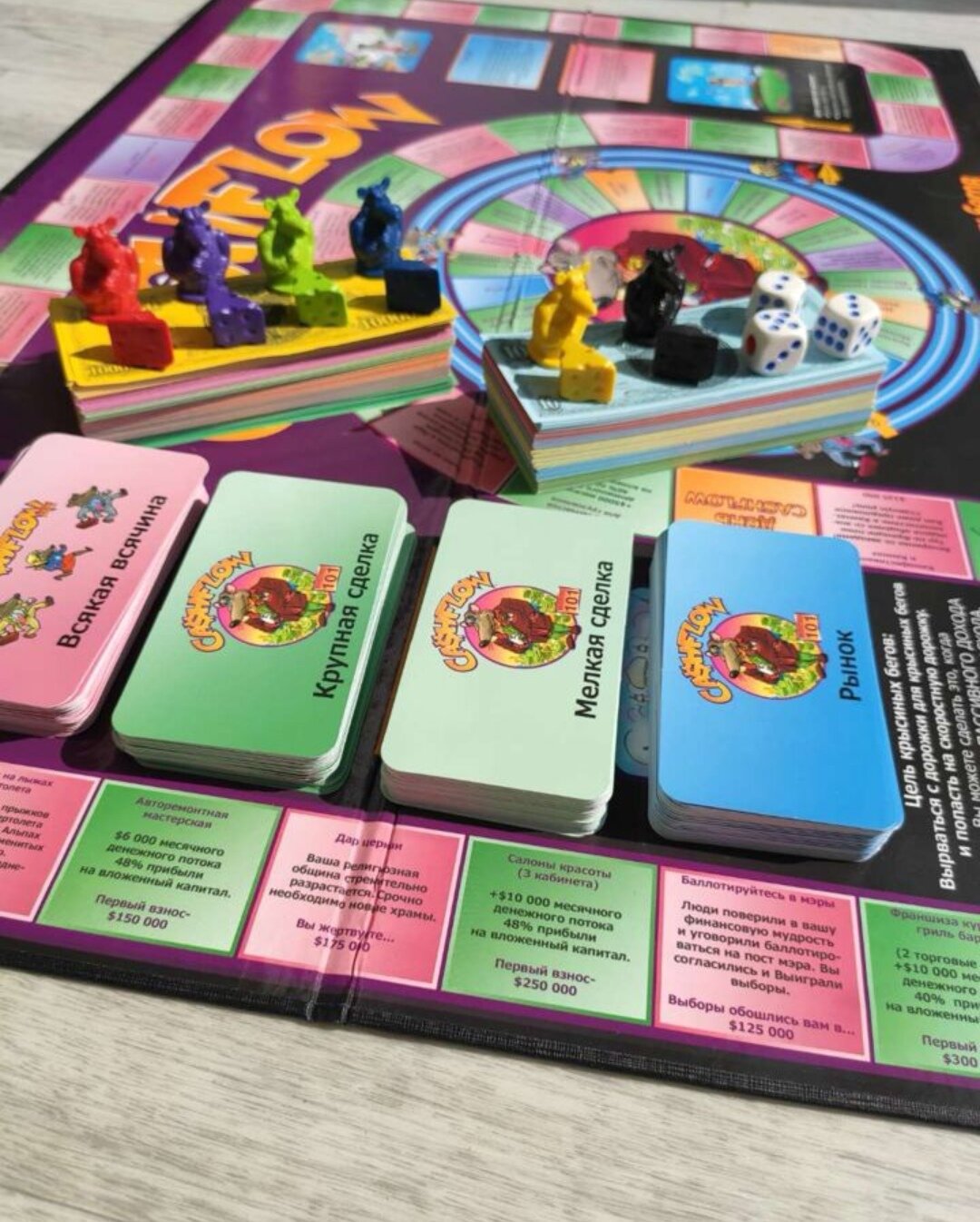 | Комплектация | Денежные купюры: номинал от 10$ до 1000000$, карандаши: 6 шт, кубик: 3 шт, Денежный поток, Крыски: 6 шт, Сырки: 6 шт, Карточки для игры "Кэшфлоу 101", Карточки для игры "Кэшфлоу 202", Бланки "Кешфлоу 101 и 202" по 6 шт, "Кешфлоу" карточки профессий: 12 шт |
