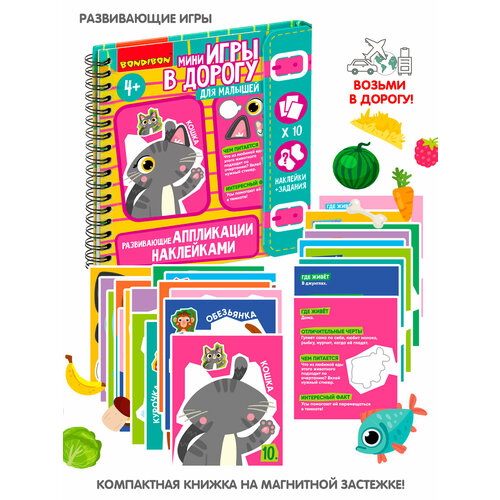 Устройте мастер класс по аппликации для малышей! Развивающие аппликации от Bondibon – это отличный способ создать яркую картинку своими руками. Ведь очень важно развивать у малыша внимание, моторику, усидчивость и логику. В наборе 10 заготовок с забавными животными и комплект наклеек. Белочка, обезьянка, козлик, курочка, зайчик, коровка, слоник, мишка, собачка, кошка. Все зверушки потеряли свои ушки, носики, хвостики, глазки. Помогите им. Приклейте детали согласно образцу. Но набор не только творческий, но и познавательный! На обороте каждой аппликации есть факты о животном и задания. Аккуратно отрежьте по обозначенной линии, и Вы получите набор игровых карточек на сортировку, память, развитие речи. Красочные и компактные, они будут идеальными спутниками для маленького непоседы. Весь набор компактно упакован в мини-книгу с магнитной застежкой. Возьмите мини-игры в дорогу – будет весело и полезно. Путешествуй интересно с Bondibon! Возраст 4+