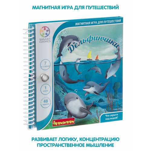 Порадуйте ребенка логической магнитной игрой для путешествий дельфинчики от Bondibon! Компактная головоломка серии Smartgames надолго увлечет детей дома и в поездке. Узнайте, что скрыто под водой! Разместите магнитные детали с дельфинами так, как указано в карточке. Найдите верное решение и проверьте его по книжке с ответами. Ваш ответ может выглядеть немного иначе, ведь дельфины под водой могут быть перевернуты на 180 градусов. Игра разовьет логическое мышление, визуальное восприятие, внимание. В набор входят: складывающаяся игровая доска, 7 магнитных элементов, блокнот с заданиями. 4 уровня сложности Возраст 7+ Количество игроков 1 Соберите коллекцию развивающих игр серии Smartgames! Развивающие игрушки в стиле тетрис или квест головоломка, в которой участвуют морские животные, понравится детям. Настолки для детей и различные умные игры – настоящий подарок для малышей в дороге или на воздухе. Развивающие развлечения покупают и в качестве игрушки для мальчиков, и как игрушки для девочек. Прикольные настольные игры поместятся на столе в поездке или в самолете. Их можно брат в машину или в детский сад. Крутая настольная игра – отличная тренировка iq. Такой нейротренажер улучшит память и логику. Развивашки для девочек и мальчиков – популярные игры для всей семьи. Учимся, играя – самая надежная стратегия развития. Манипуляции с игровыми фишками улучшают мелкую моторику. Интересная мини игра – отличный напарник для посещения детского сада, для забав вне дома и для улицы. Проведите уличные соревнования с друзьями: некоторые задания подойдут для компании на природе, обеспечив взрыв мозга. Коробка от Бондибон – оригинальное дополнение в подарочный набор на новый год или на день рождения, отличный новогодний подарок или сюрприз на любой праздник. Такие детские игрушки – популярные товары интернет магазинов круглый год!
