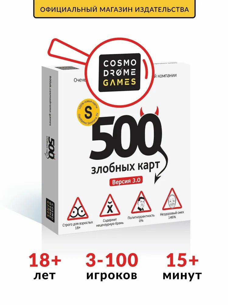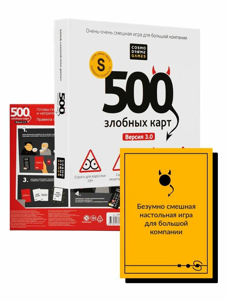 «500 Злобных карт 3.0» — игра, которая превращает любую вечеринку в шоу без цензуры** Если вы ищете способ сделать вечер с друзьями по-настоящему запоминающимся — забудьте о банальных настолках и скучных разговорах. «500 Злобных карт 3.0» от Cosmodrome Games — это смелая, дерзкая и невероятно весёлая карточная игра для взрослых, которая моментально разогревает любую компанию. Здесь нет места скуке: только смех, провокации и юмор на грани дозволенного. Что вас ждёт? Это не просто продолжение — это полноценная, обновлённая версия игры, в которую вложено всё лучшее из предыдущих выпусков, плюс новые фразы, свежие шутки и ещё больше поводов для веселья. Внутри вы найдёте игровые фишки, поле и три дополнительных набора карт, выполненных из плотного картона — игра прослужит долго и выдержит десятки вечеринок. Как играть? Один игрок становится ведущим и зачитывает фразу с пропуском. Остальные выбирают из своих карт самый остроумный или неожиданный вариант продолжения. Ведущий зачитывает все ответы вслух и выбирает тот, что рассмешил его больше всего. Побеждает тот, кто сумеет чаще всех попасть в точку — или, наоборот, в самую нелепую ситуацию. Почему стоит купить «500 Злобных карт 3.0»? - Простые правила — начать играть можно уже через пару минут после распаковки.