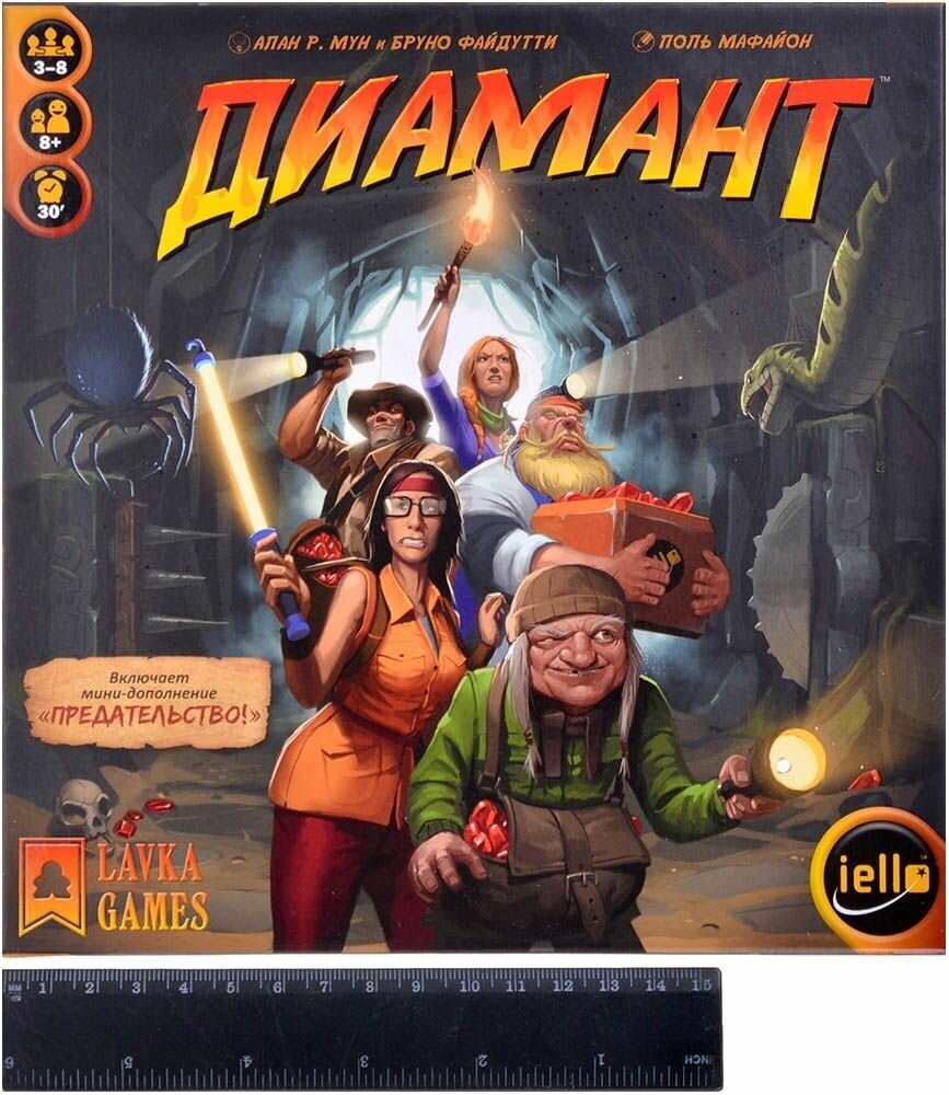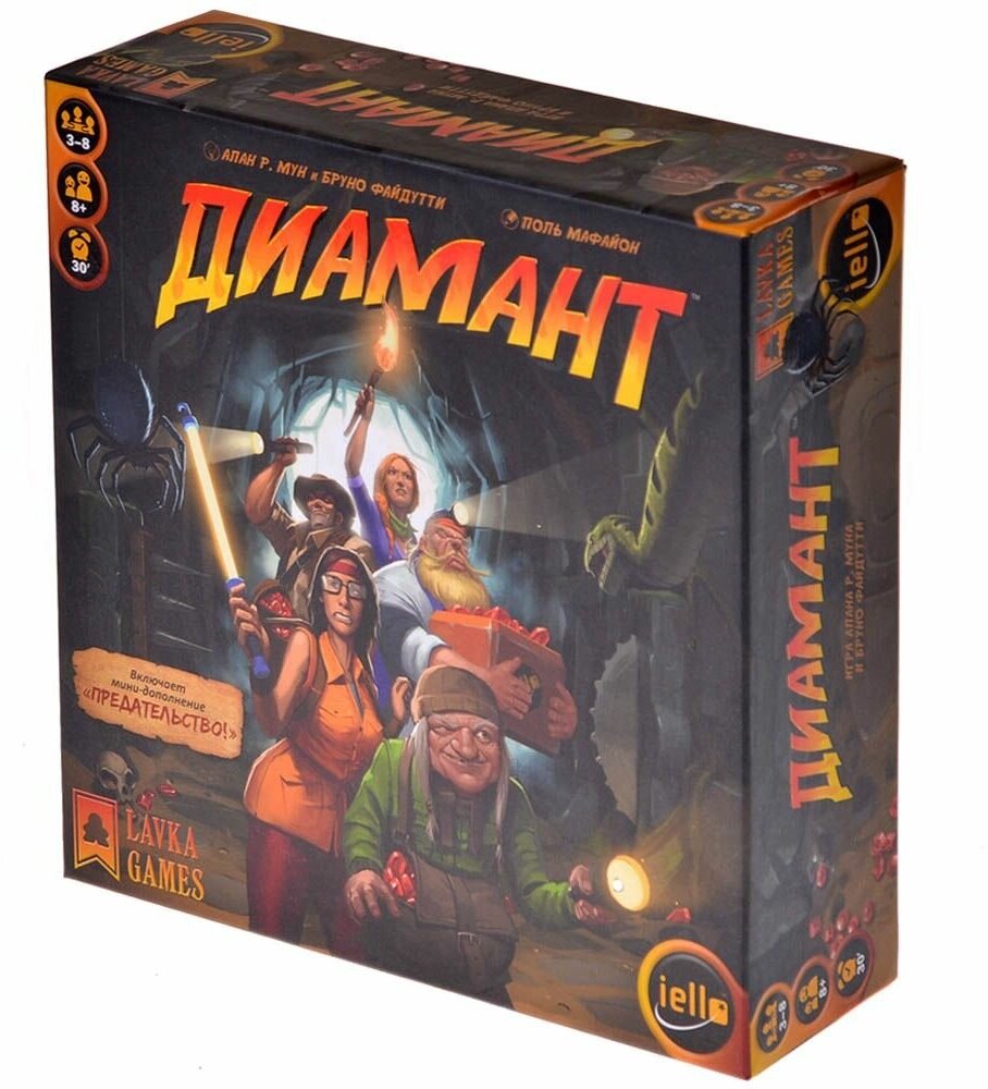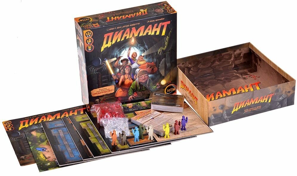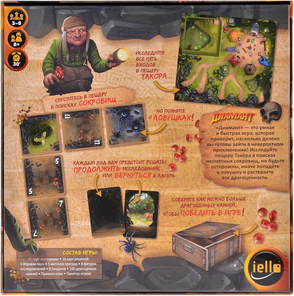 «Диамант» – игра для тех, кто любит риск, блеск сокровищ и опасность! Это – простая и увлекательная настольная игра на проверку удачи и жадности, в которой вам предстоит исследовать пещеры, собирать сокровища и реликвии, а также избегать ловушек.