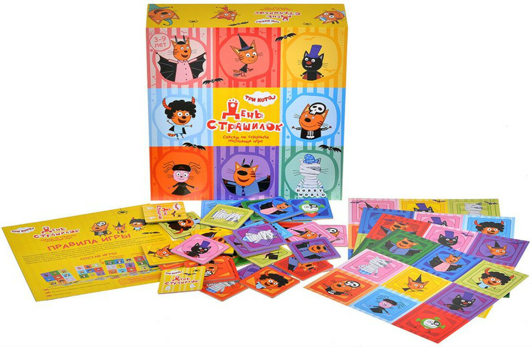 Присоединяйтесь к весёлому празднику с любимыми героями мультсериала «Три кота»! Котята устраивают День страшилок: вокруг всё украшено бумажными паучками и привидениями, а малыши облачились в милые, но немного страшные костюмы. Вас ждут интересные задания — открывайте жетоны с персонажами и подбирайте их к картинкам на планшете. Семейная настольная игра с двумя уровнями сложности и специальным режимом для развития памяти сделает время с детьми незабываемым.