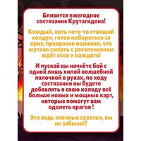 230 карт, 5 черепушек для отсчёта жизней, 8 жетонов колдунских свойств, 8 планшетов колдунов, 20 жетонов дохлых колдунов, Р’льех, главный приз Крутагидона, правила игры