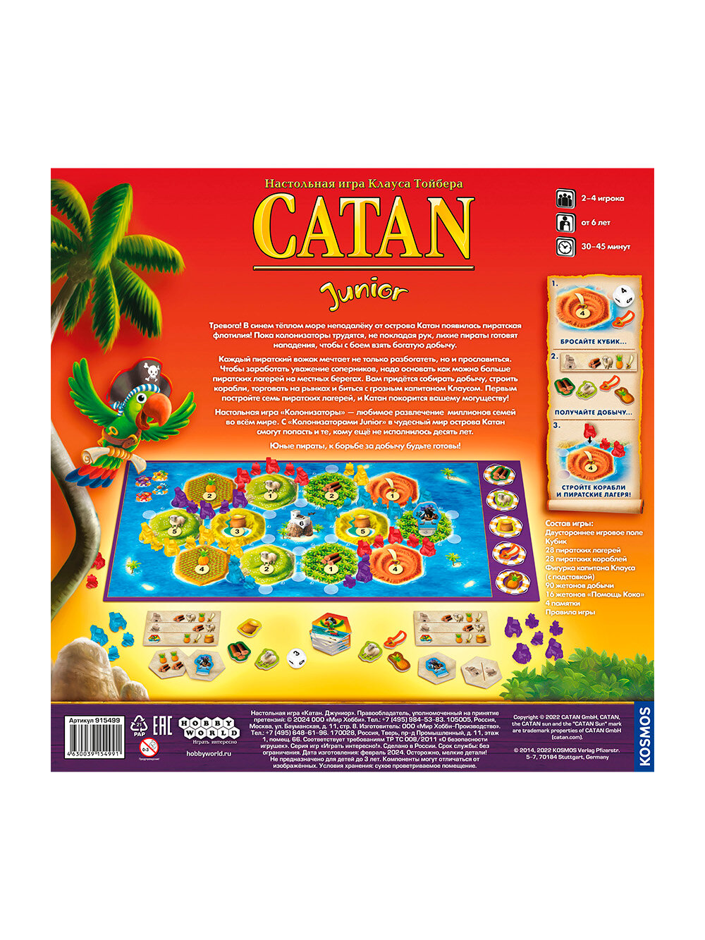 Каждый пиратский вожак мечтает не только разбогатеть, но и прославиться. Чтобы заработать уважение соперников, надо основать как можно больше пиратских лагерей на местных берегах. Вам придётся собирать добычу, строить корабли, торговать на рынках и биться с грозным капитаном Клаусом. Первым постройте семь пиратских лагерей, и Катан покорится вашему могуществу!