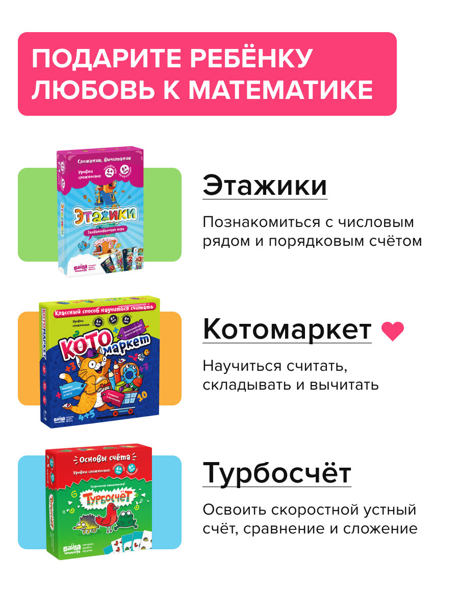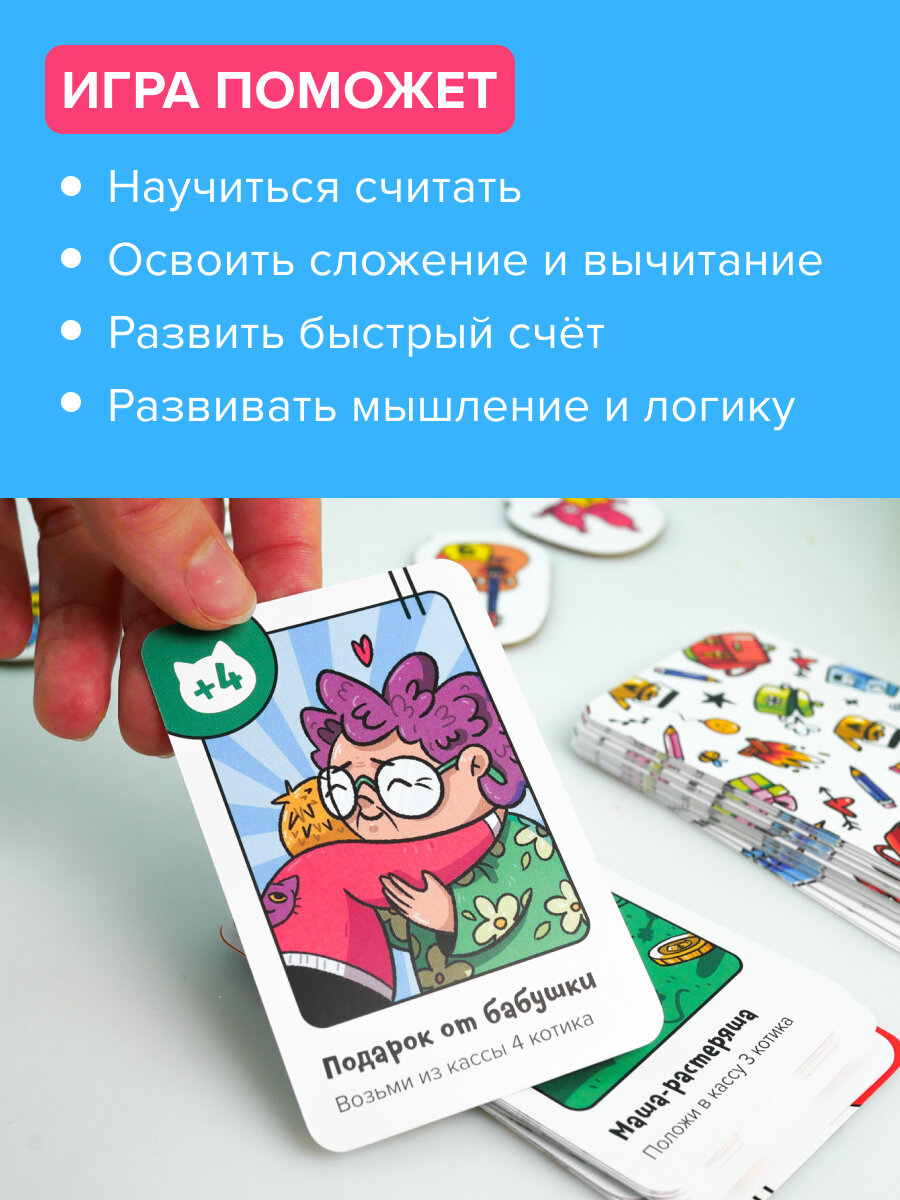 Уникальная игровая методика обучения счету от международной команды методистов, нейропсихологов и специалистов в области игрового обучения. Учиться считать бывает непросто: психологи отмечают, что у многих детей развивается «математическая тревожность», которая тормозит их прогресс в учебе. Любимая игра детства превратилась в уникальную обучающую методику, которая помогает быстро и эффективно осваивать счет, сложение и вычитание. Это гораздо эффективнее, чем примеры со счетными палочками и сложением яблок. В процессе игры дети от 4, 5, 6, 7, 8 лет развивают мышление и улучшают свои навыки для успеха в математике. Игровой сюжет поддерживает прогресс ребенка в любом возрасте: малыши покупают свои первые товары, ребята постарше идут в магазин со списком покупок, а школьники открывают собственный супермаркет. Отличный вариант для подготовки к школе и полезный подарок на класс или в садик на любой праздник. В комплекте Касса, встроенная в коробку 40 фигурных жетонов с товарами 50 карт действия 8 планшетов со списками покупок 12 бонусных жетонов 48 жетонов-монет 4 таблички-памятки Иллюстрированные правила