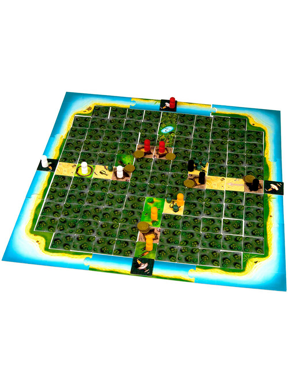 55 клеток, из которых будет собран остров, 4 клетки кораблей, 12 фигурок пиратов — по 3 фигурки красного, жёлтого, чёрного и белого цветов, 16 монет, 9 карт пиратских способностей, 4 бутылки с посланиями, фигурка миссионера, наклейки для обозначения пиратских способностей, шестигранный кубик, памятка со значением клеток и кратким содержанием хода, правила игры
