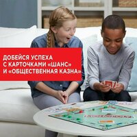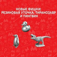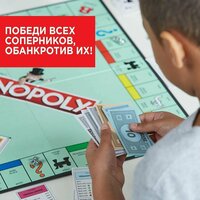 Настольная игра Монополия (Monopoly) от компании Hasbro превращает вас и ваших друзей в успешных (и не очень) бизнесменов. Кому на этот раз удастся сколотить состояние на торговле недвижимостью? Узнайте скорее! Какие выгоды сулит настольная игра «Монополия»? Трудовой день среднестатистического бизнесмена полон событий. Покупайте и продавайте земельные участки, сдавайте их в аренду и стройте на них дома, взимайте арендную плату с других игроков, берите и возвращайте долги, совершайте сделки с банком и своими товарищами. Выигрывает самый богатый! Что в коробке: игровое поле из толстого картона 28 карточек Собственника 16 карточек «Общественная Казна» 16 карточек «Шанс» 8 металлических фишек (динозавр, кот, шляпа, собака, пингвин, уточка, машина, пароход) 32 пластмассовых дома 12 пластмассовых отелей 2 игральных кубика пачка денег инструкция Игра создана для 2-8 участников старше 8 лет. Для чего нужны карточки, постройки и деньги На карточка собственника указана цена домов и отелей, размеры арендной платы и залоговая стоимость участков. На карточках «Общественная Казна» и «Шанс» указаны различные действия, которые должен совершить игрок. Например, он должен получить деньги или заплатить налоги, передвинуть фишку, отправиться в тюрьму и др. Пластмассовые дома и отели нужны для игроков, начавших строительство на своих участках, а деньги – для расчетов с банком и между участниками. Правила настольной игры «Монополия» Игроки выставляют свои фишки на поле «Вперед» и ходят по кругу на то количество ходов, которое выпадает на кубиках. По ходу движения они покупают, продают, строят и закладывают недвижимость, платят арендную плату, совершают сделки с банком и другими игроками, получают зарплату, выполняют действия, указанные на игровых полях, карточках «Шанс» и «Общественная казна». Один из участников выбирается банкиром. Он, кроме своих сделок, совершает все финансовые операции: выдает зарплату и кредиты, взимает долги с процентами, передает документы на право собственности и т. д. Если игроков много, банкир может не участвовать в гонке за капиталом, а только выполнять свои функции. Игроку следует стремиться к тому, чтобы собрать все участки одного цвета и стать монополистом. В этом случае его доходы значительно возрастают. Успех каждого зависит от умения вести сделки планировать свои действия, разрабатывать тактику и стратегию! Польза для развития ребенка Игра осуществляет экономическое воспитание, учит ребенка правильно относиться к деньгам, продумывать схемы для развития предприятий. Участники стремятся к налаживанию партнерского диалога, что положительно сказывается на развитии речи. О бренде: Первые игрушки Hasbro увидели свет еще в 1940 году! С тех пор этот бренд – синоним веселья и развлечений. Главная фишка – настольные игры для больших компаний. Добейтесь успеха в большом бизнесе с настольной игрой «Монополия»! Параметры товара: размер поля 500х500 мм, размер банкноты 100х50 мм, размер карточки 85х55 мм, размер фишки от 17 до 30 мм, кубик 15х15х15 мм, размер дома 10х10х10 мм, размер отеля 15х15х15 мм, упаковка – картонная коробка 400х270х50 мм, вес 895 г