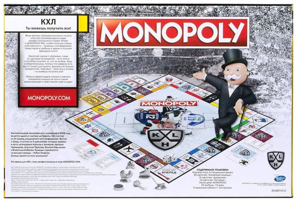 | Комплектация | Игровое поле 6 специальных фишек 28 карточек ""Хоккейная команда"" 16 карточек ""Гостевые"" 16 карточек ""Домашние"" 1 комплект специальных денег для Монополии 32 трибуны 12 арен 2 игральных кубика и инструкция |